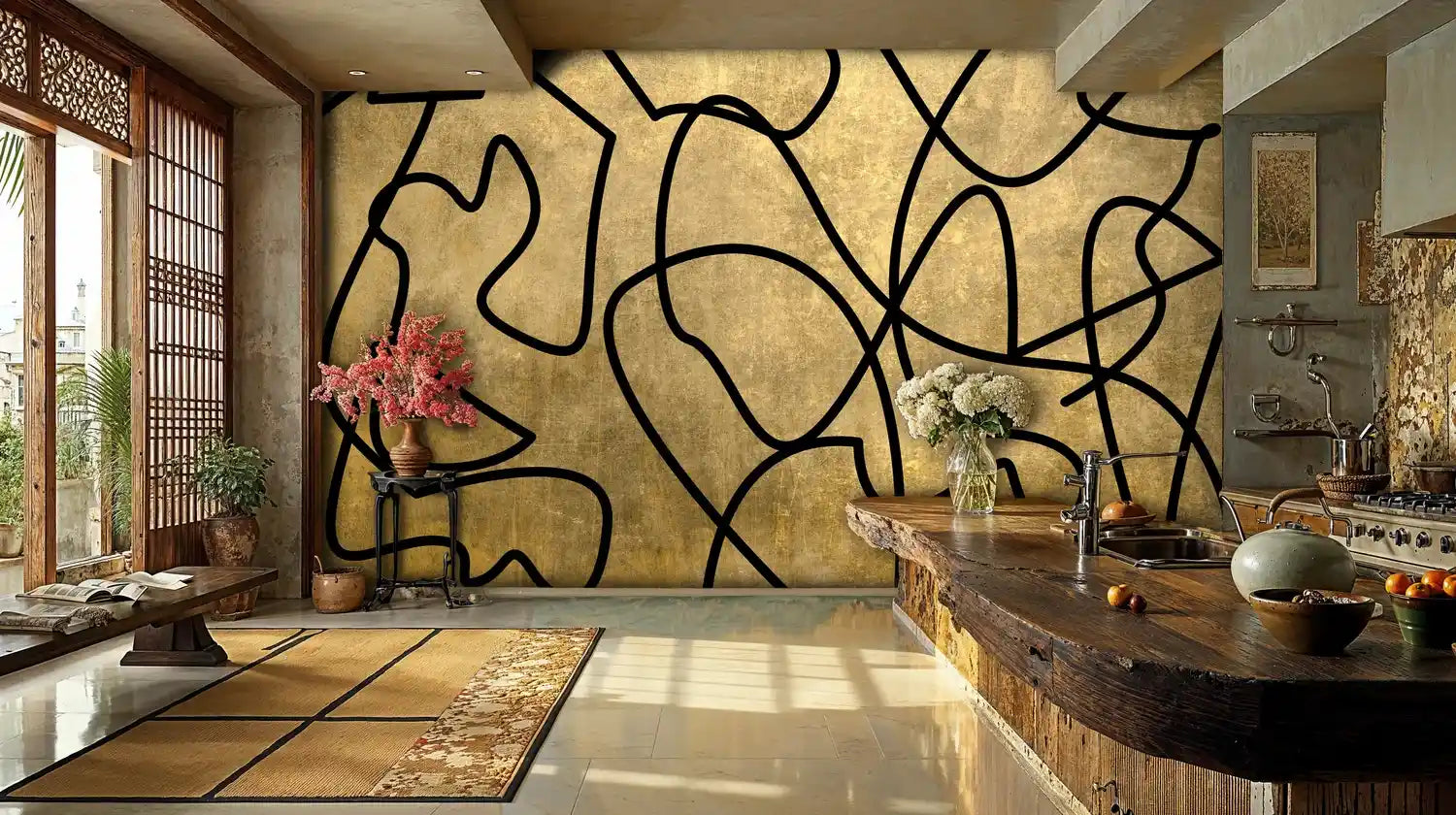 Step into a world where modern sophistication meets artistic expression with this stunning Abstract Interlocking Lines Wall Mural. Inspired by contemporary line art movements, this design features bold black curves that dance and interweave across a luxurious golden background, creating an atmosphere of refined elegance. Each flowing line tells its own story while connecting to form a mesmerizing pattern that captures the eye and sparks conversation. Atelier Merien brings you this masterpiece that transforms any room into a curated gallery space.