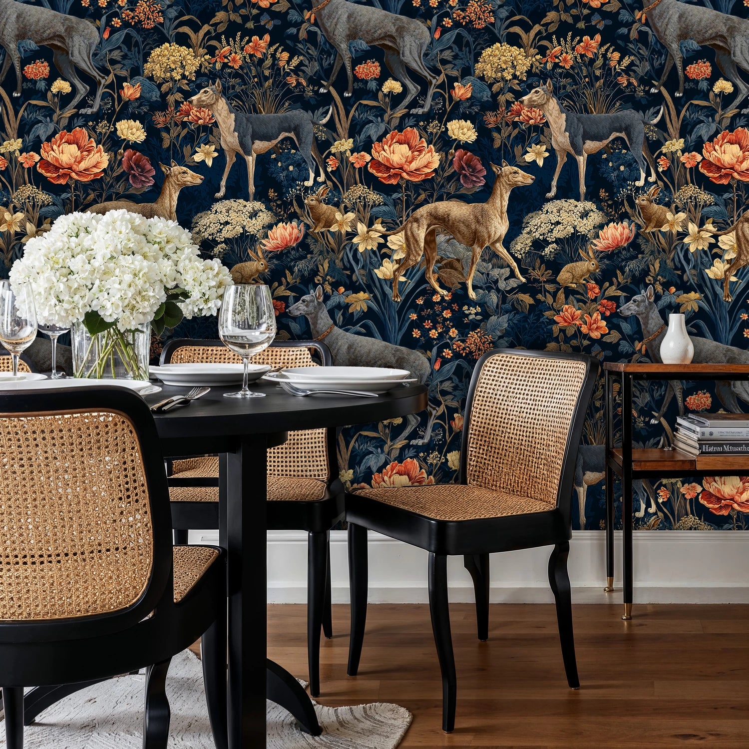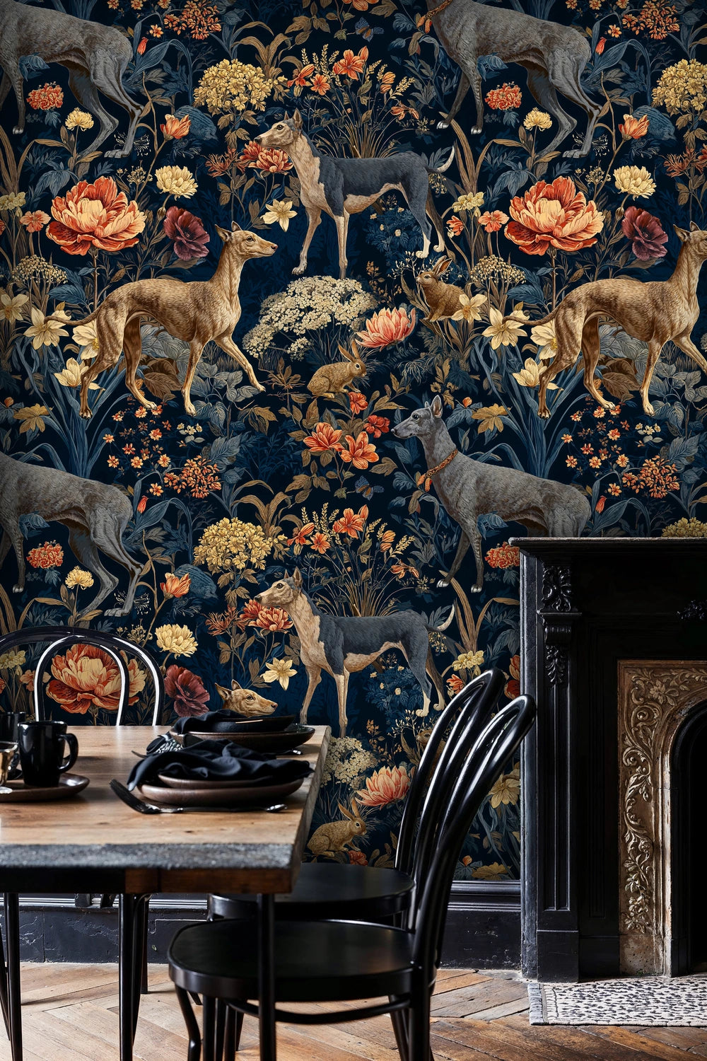 Every element is thoughtfully composed: graceful greyhounds, curious rabbits, and layered foliage rendered with fine, illustrative linework. Large blooms anchor the pattern while smaller wildflowers weave throughout, delivering a balanced repeat that feels immersive yet elegant. The midnight palette highlights the warm botanicals, ensuring the design reads as sophisticated rather than busy.