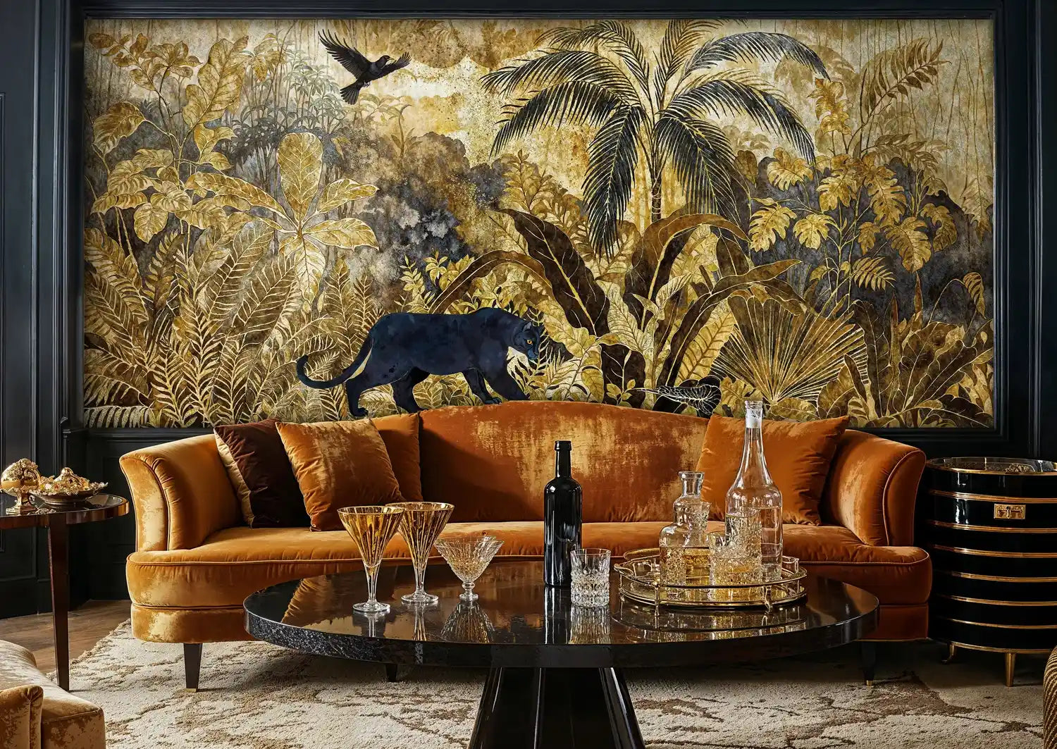 - This dramatic mural works beautifully with maximalist, eclectic, and modern glam interiors. It pairs exceptionally well with rich textures like leather, velvet, and natural wood, creating a sophisticated jungle-inspired aesthetic.