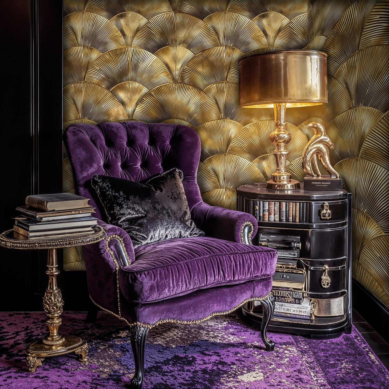 Lean into modern glam with velvet seating, brass accents, and smoked glass; or create a moody lounge with dark wood and marble. This art deco wallpaper shines in living rooms, dining rooms, bedrooms, and powder rooms, especially when paired with warm lighting that enhances the metallic look.