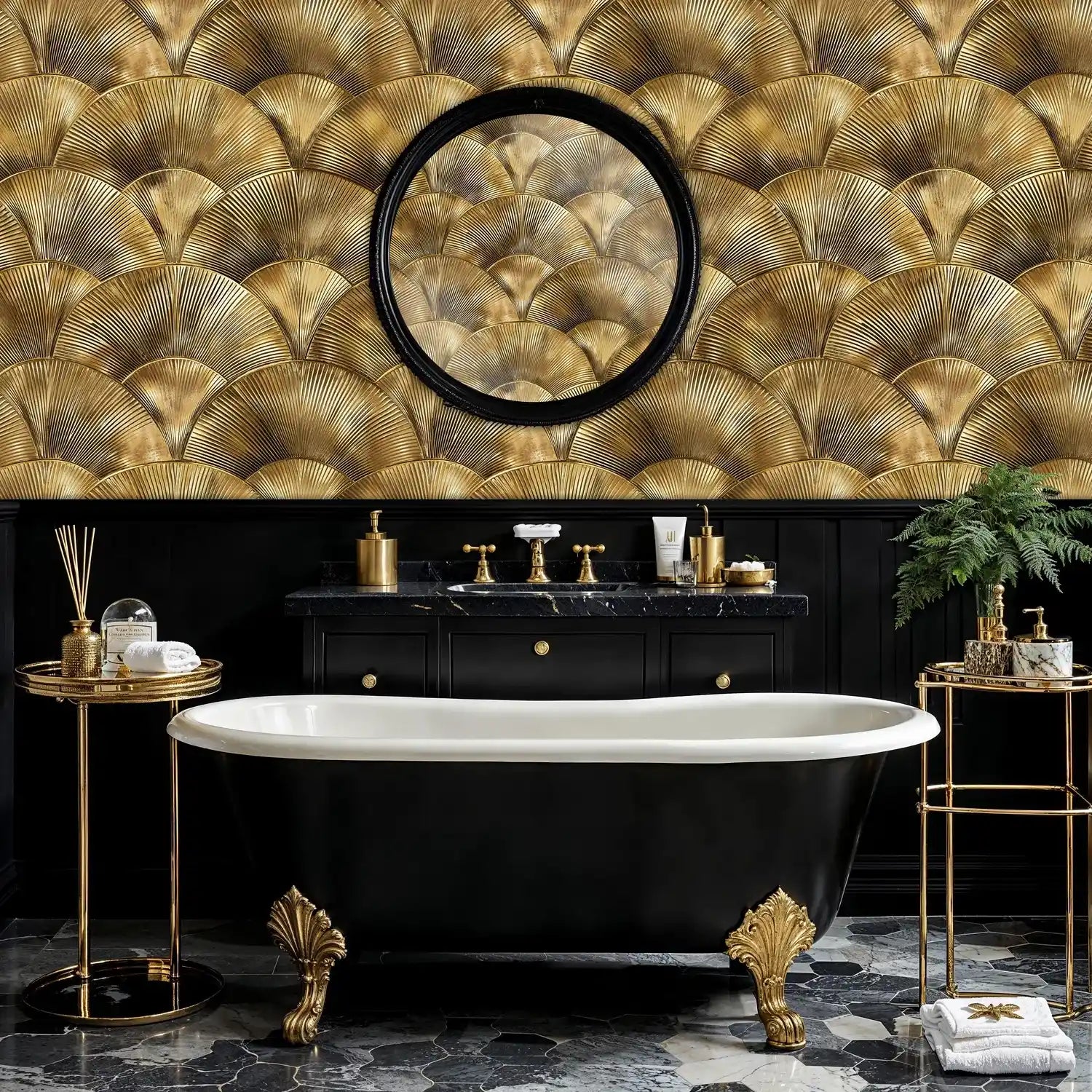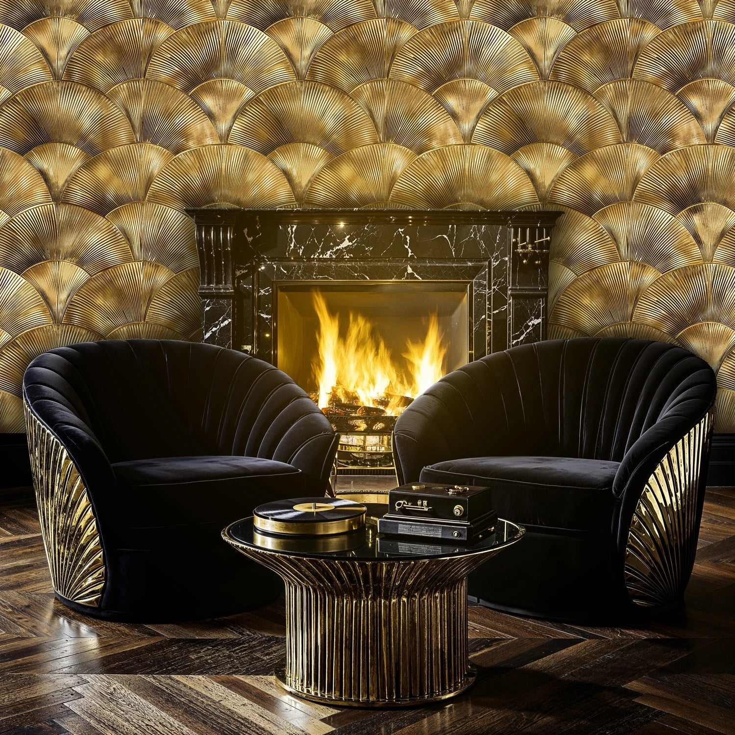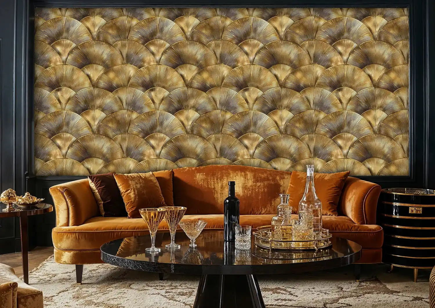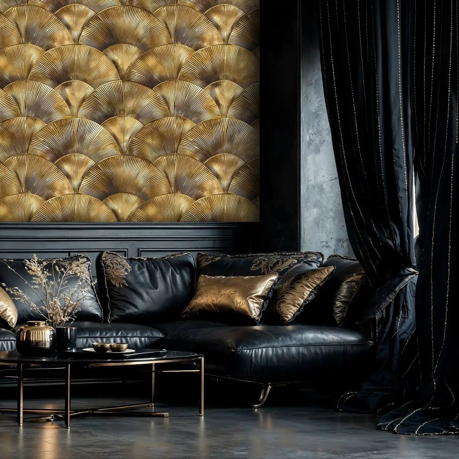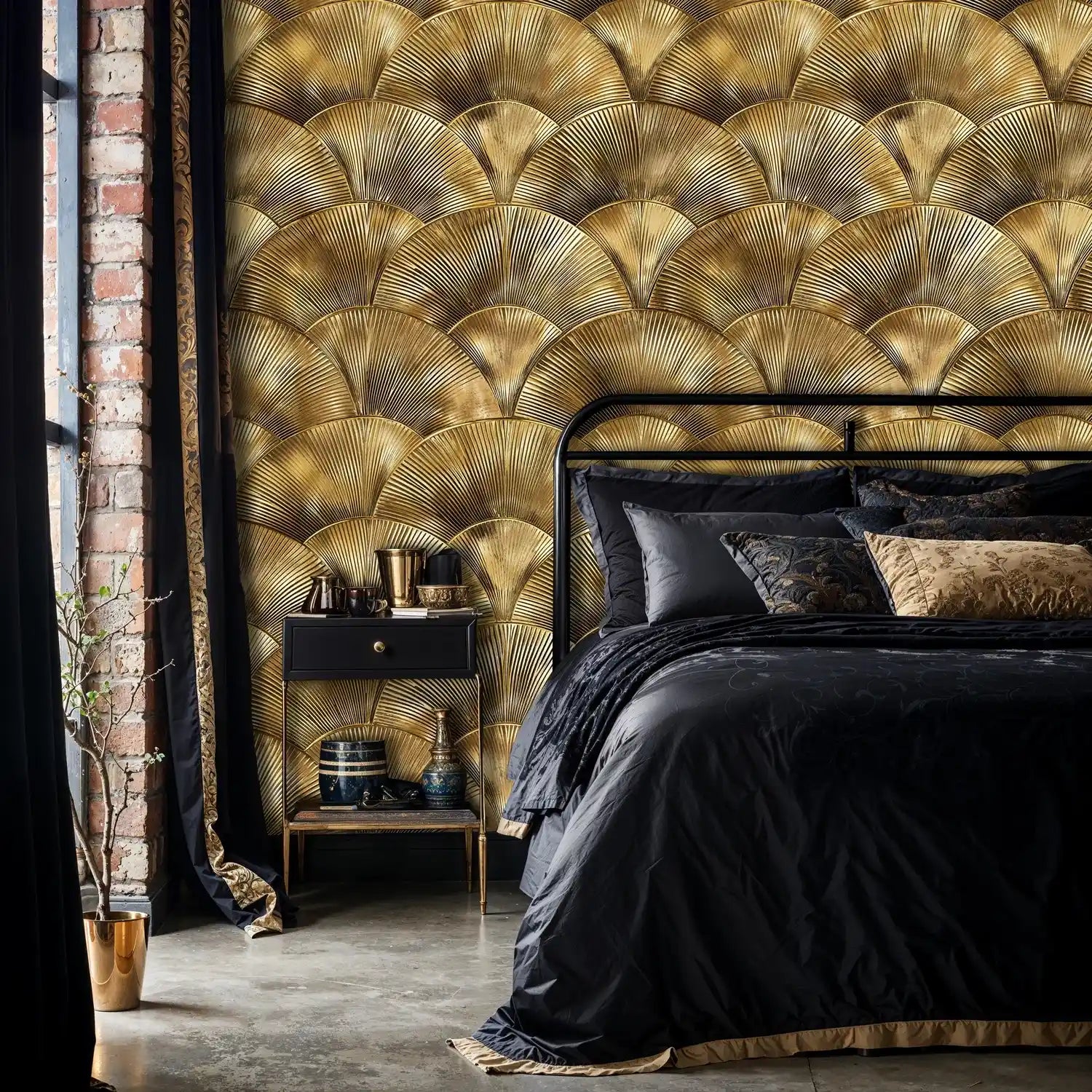 Imagine a wall that glows like a softly lit lounge. Overlapping fans unfurl in sculpted arcs, their ribbed lines catching light and shadow to create a luminous, dimensional rhythm. This Art Deco Wallpaper evokes glamorous evenings and intimate salons, yet feels strikingly modern in a curated home. Rendered in burnished gold with deep charcoal accents, the scalloped motif forms a repeating wave that anchors a room with confidence and poise. Designed by Atelier Merien, it brings the drama of a statement mural while remaining refined and versatile. Use it to frame a sitting area, elevate an entryway, or turn a bedroom headboard wall into a work of art.