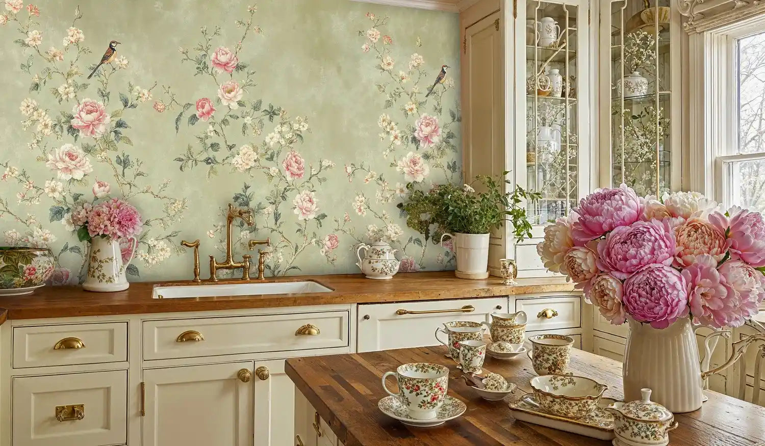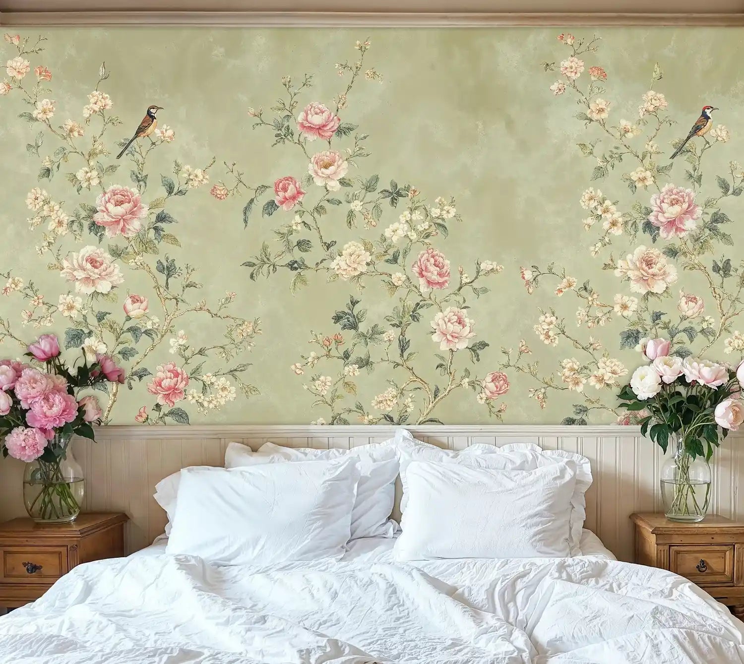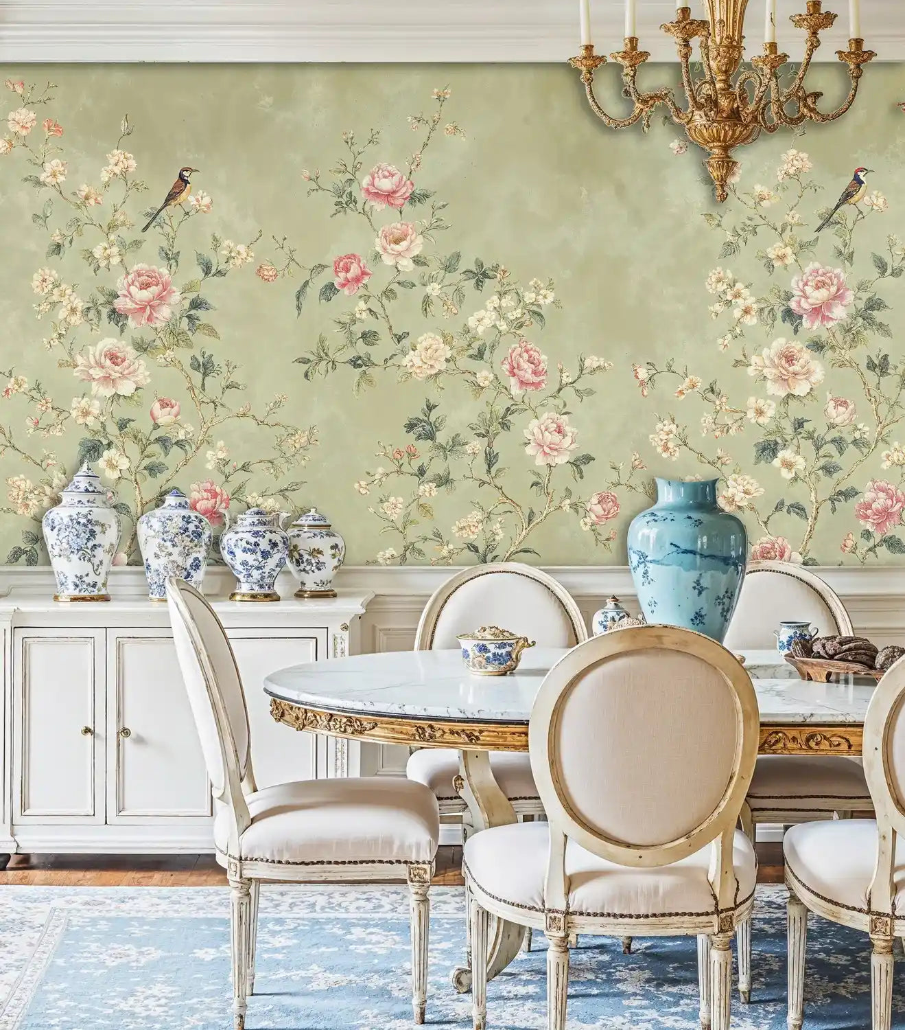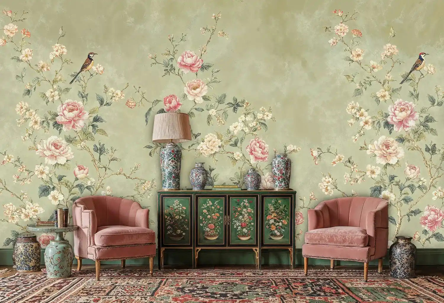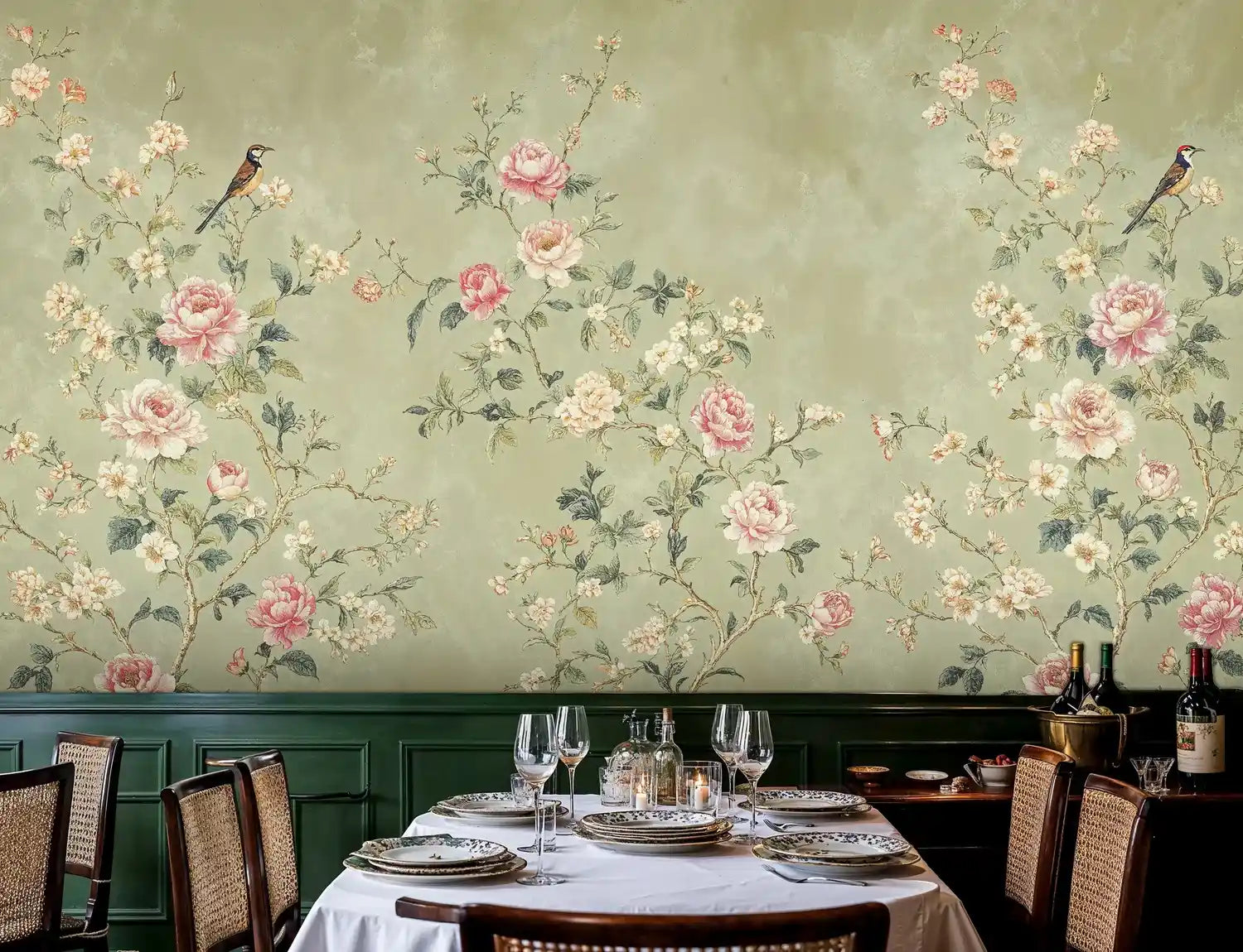 Pair this floral bird mural with blush or ivory upholstery, warm brass hardware, rattan or caned details, and light woods. Wainscoting, marble-topped tables, and vintage rugs enhance its romantic mood while the greenery and soft pink palette keep rooms feeling fresh and calm.