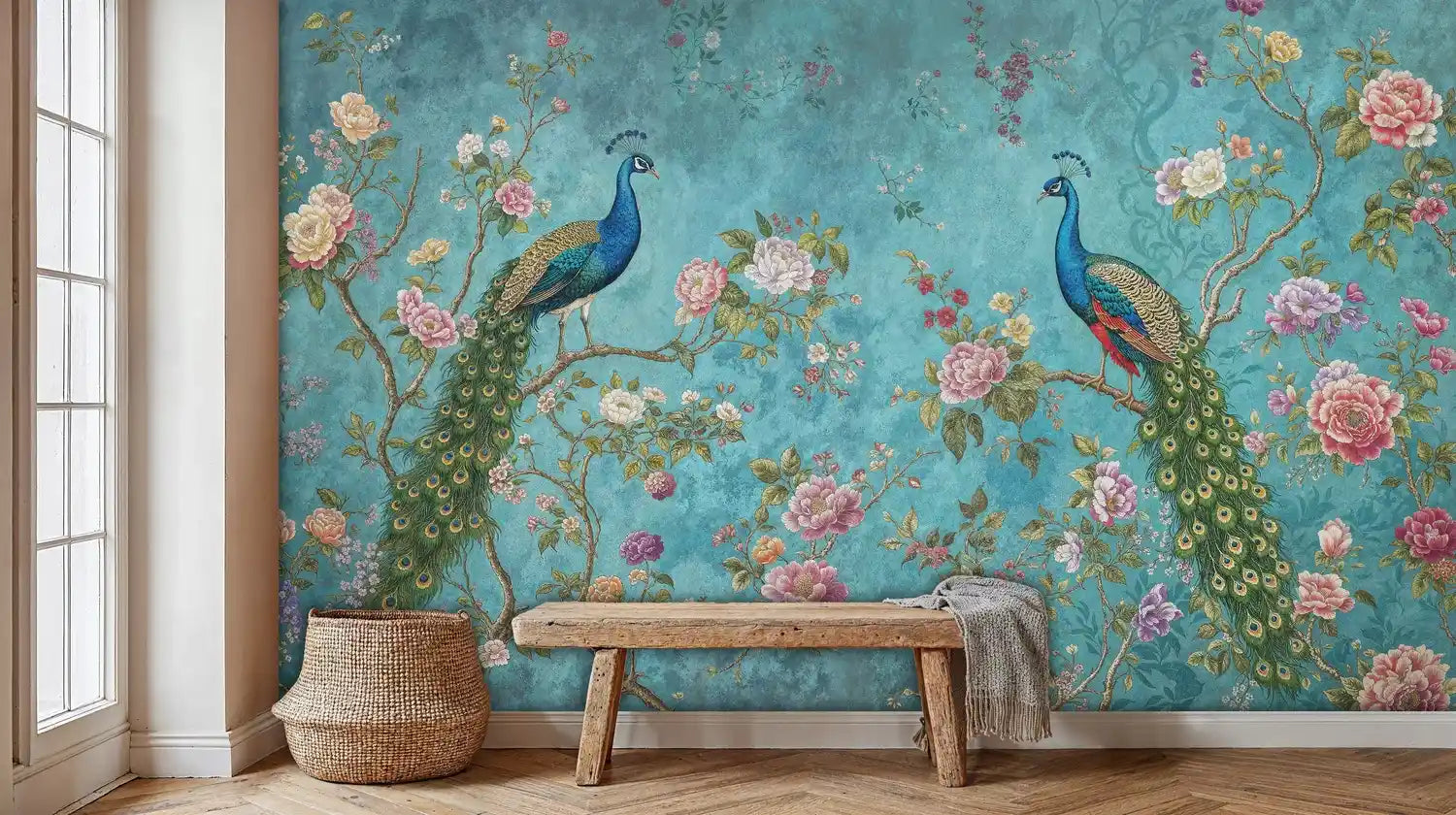 Two jewel-toned peacocks perch among flowering branches as their long tails cascade through a garden of roses and leaves. A softly textured teal sky sets a serene backdrop that lets every brushlike stroke and gilded detail glow. Inspired by hand-painted chinoiserie panels and ornamental gardens, this Wall Mural turns a plain wall into a story of color, movement, and calm. Designed by Atelier Merien, the scene celebrates harmony between birds and botanicals, making living rooms, bedrooms, and dining spaces feel layered, artful, and complete.