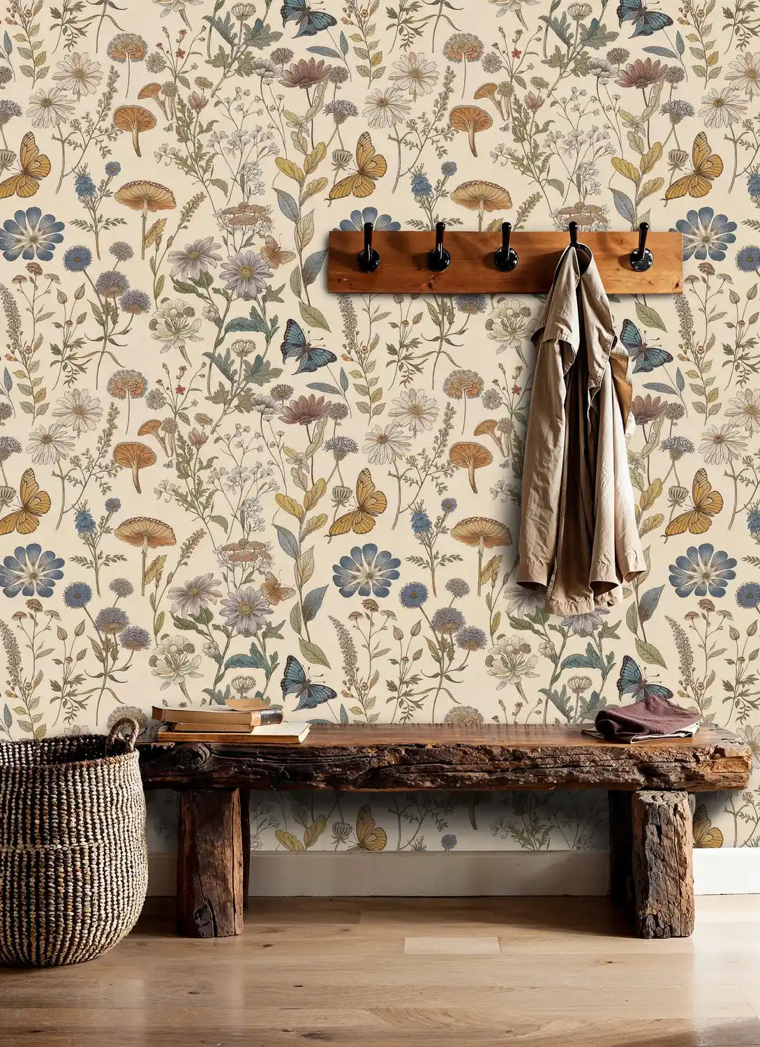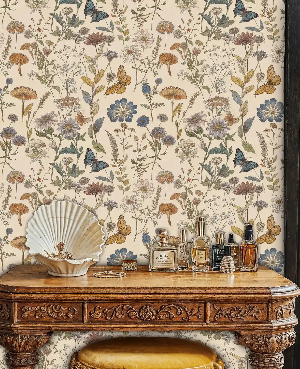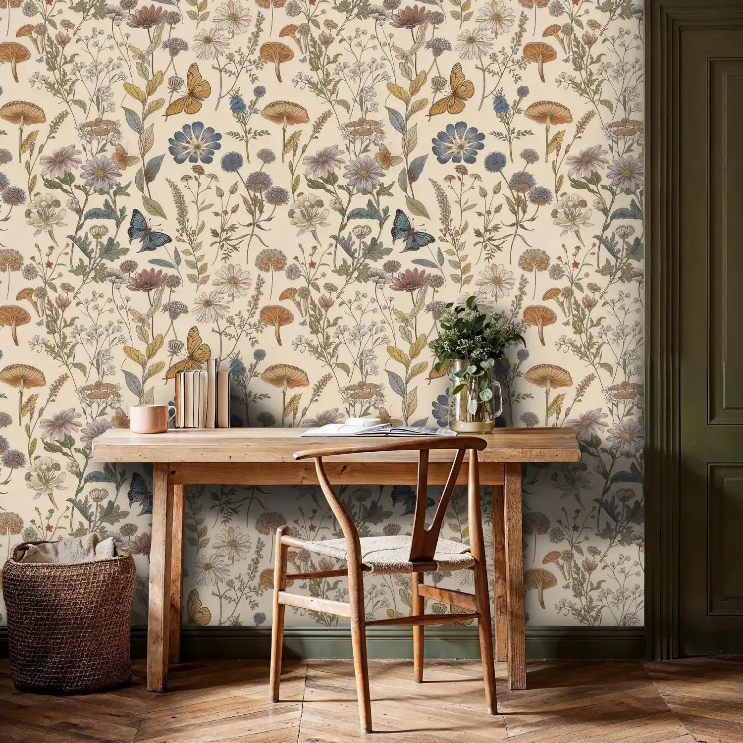 Imagine sunlight drifting across a quiet meadow, where delicate blooms nod and butterflies hover in a gentle dance. This Wallpaper captures that easy poetry with finely drawn wildflowers, softly shaded mushrooms, and fluttering wings set on a creamy backdrop. Inspired by botanical illustration and rendered with a warm, hand-touched character, it brings nature’s calm indoors. Designed by Atelier Merien, the composition feels airy yet abundant, inviting you to pause and breathe. Earthy ochres, misty blues, and fresh greens mingle in harmony, creating a soothing palette that plays beautifully with wood, linen, and woven textures. Let this print turn your room into a serene retreat and a daily reminder of the simple charm of the outdoors.