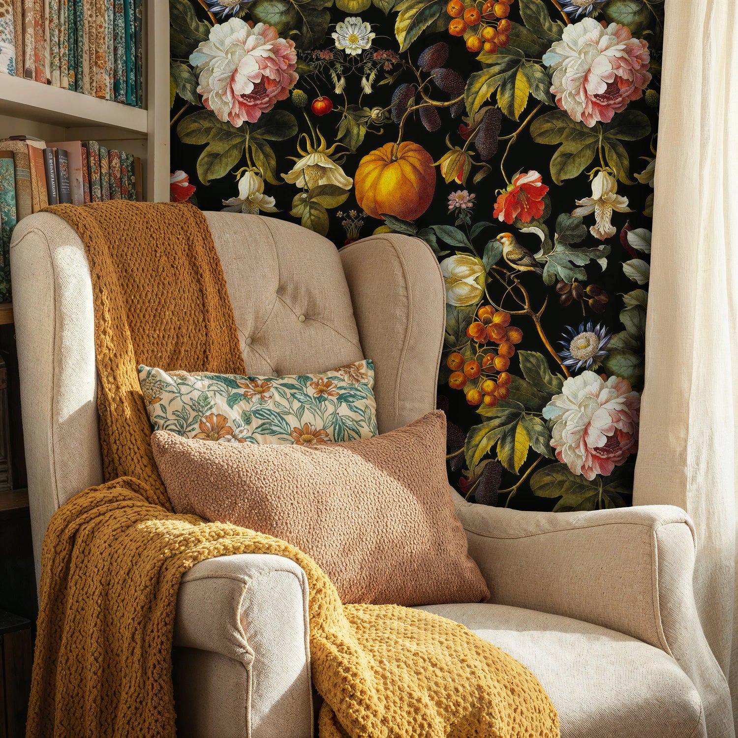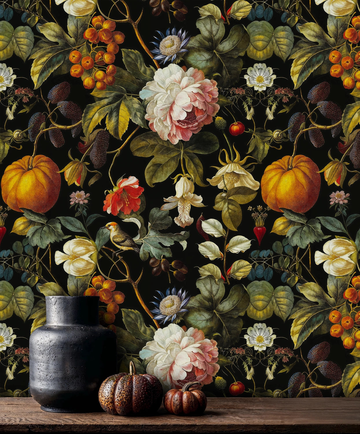 Step into a world where nature's bounty meets artistic mastery. This exquisite wallpaper captures the essence of a lush botanical paradise, where vibrant peonies dance alongside golden pumpkins and delicate wildflowers create an enchanting tapestry against a rich, dramatic backdrop. Inspired by classical still-life paintings, this design brings the timeless beauty of nature's harvest into your home. Atelier Merien has crafted this piece to evoke the wonder of wandering through a secret garden where every turn reveals new treasures waiting to be discovered.