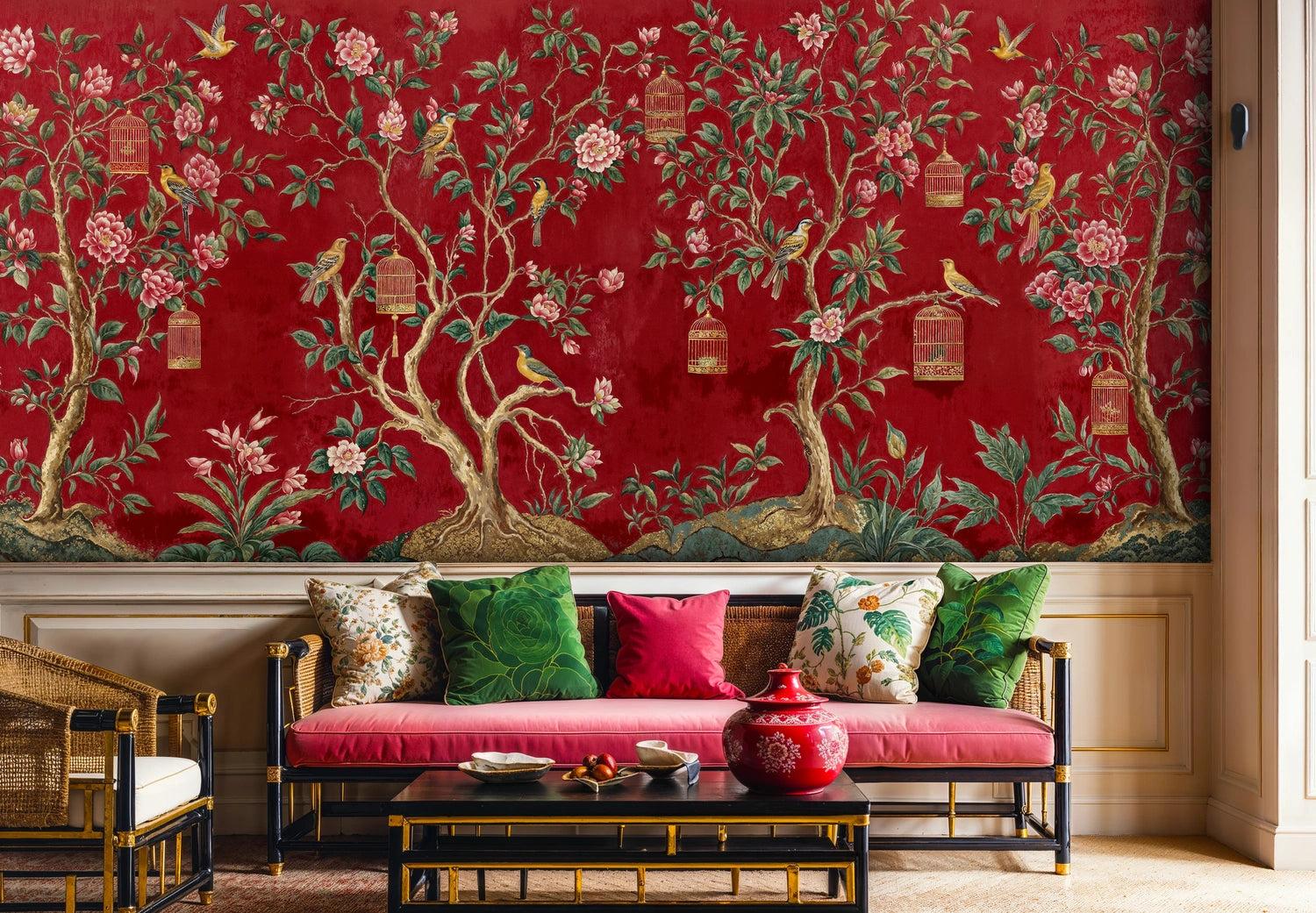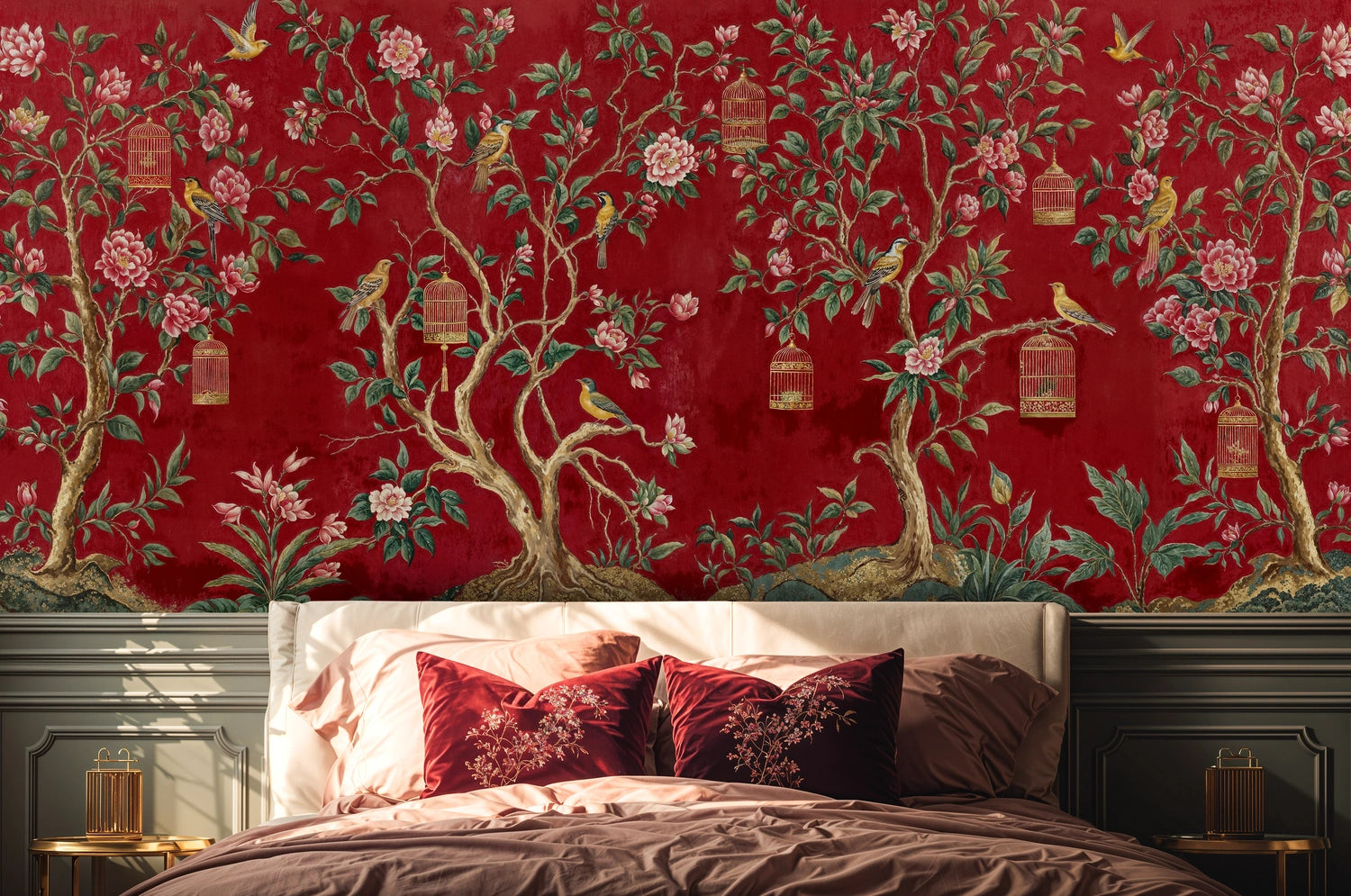Step into a world where artistry meets nature with this exquisite Chinoiserie Garden Wall Mural. Inspired by classical hand-painted silk screens, this design captures the timeless elegance of flowering branches, golden songbirds, and delicate bamboo cages against a rich crimson backdrop. Each element tells a story of serenity and sophistication, creating an atmosphere that transports you to a tranquil oriental garden. Atelier Merien brings this masterpiece to your walls, transforming any room into a sanctuary of artistic beauty.