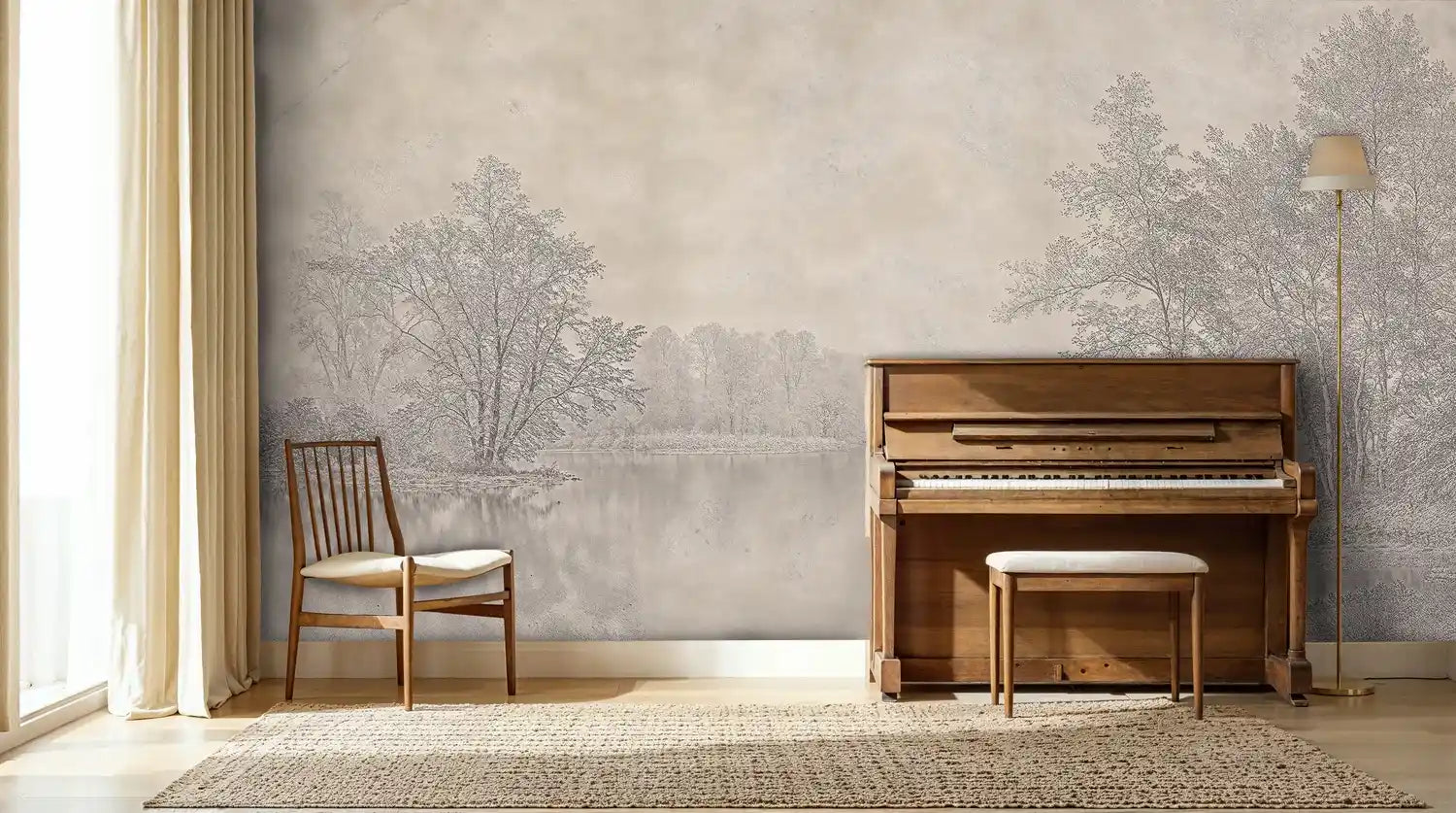 Step into a world of quiet contemplation where misty waters meet ancient woodlands in perfect harmony. This enchanting Wall Mural captures the ethereal beauty of a lakeside forest, rendered in delicate sepia tones that evoke the timeless elegance of classical landscape paintings. Every intricate detail, from the graceful silhouettes of towering trees to the mirror-like reflections dancing across calm waters, has been masterfully crafted by Atelier Merien to bring the peaceful essence of nature into your living space.