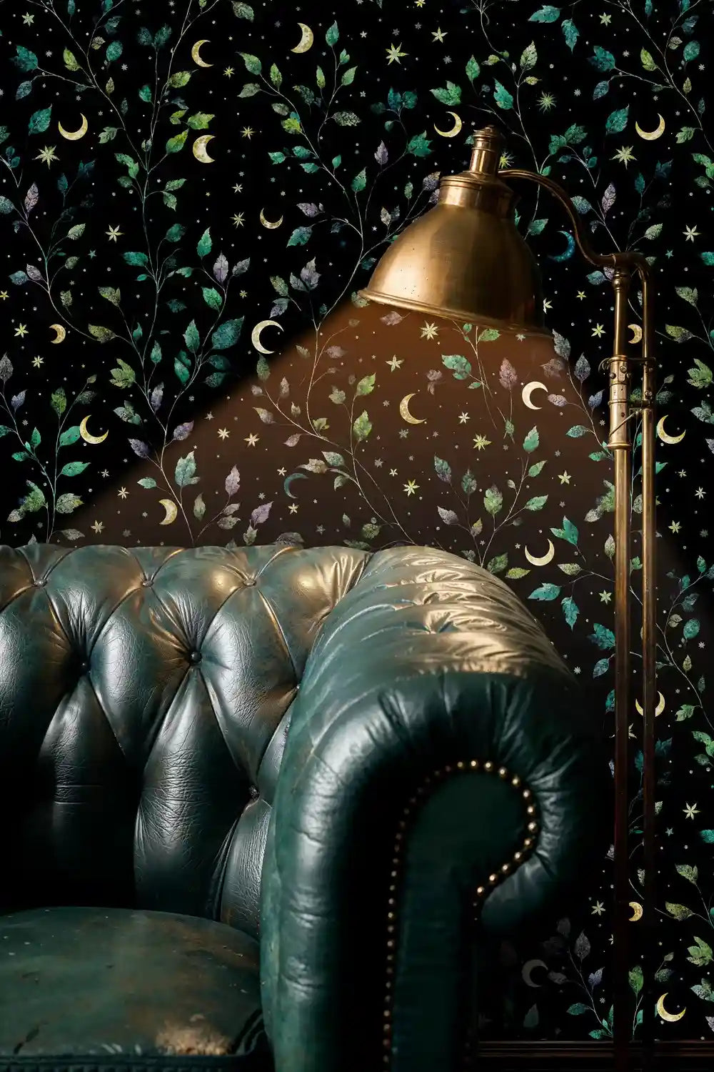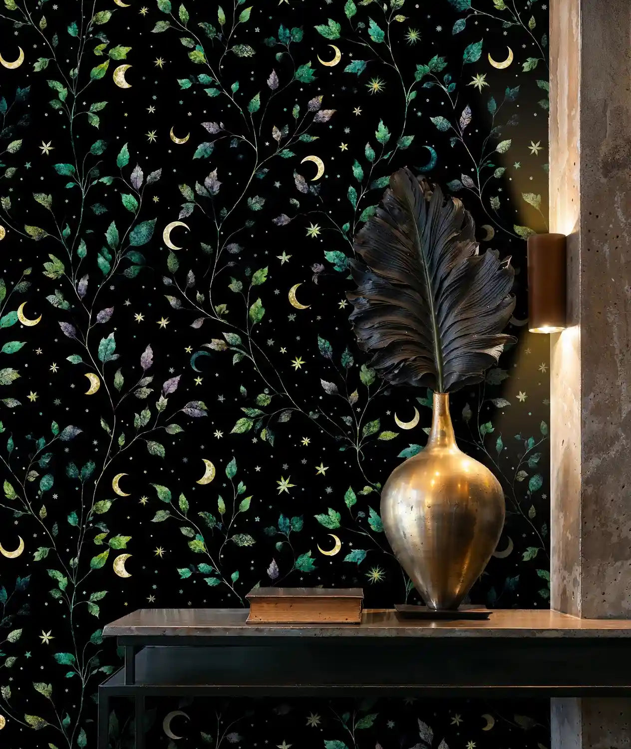 Step into a world where earthly beauty meets celestial wonder. This mesmerizing wallpaper by Atelier Merien captures the magic of a midnight garden, where delicate botanical branches dance beneath golden crescent moons and twinkling stars. Inspired by the romantic notion of secret gardens that bloom under starlight, this design brings an air of mystique and natural elegance to any space. The intricate pattern weaves together watercolor-style leaves in rich emerald and sage tones against a deep black backdrop, creating a sophisticated botanical sanctuary on your walls.
