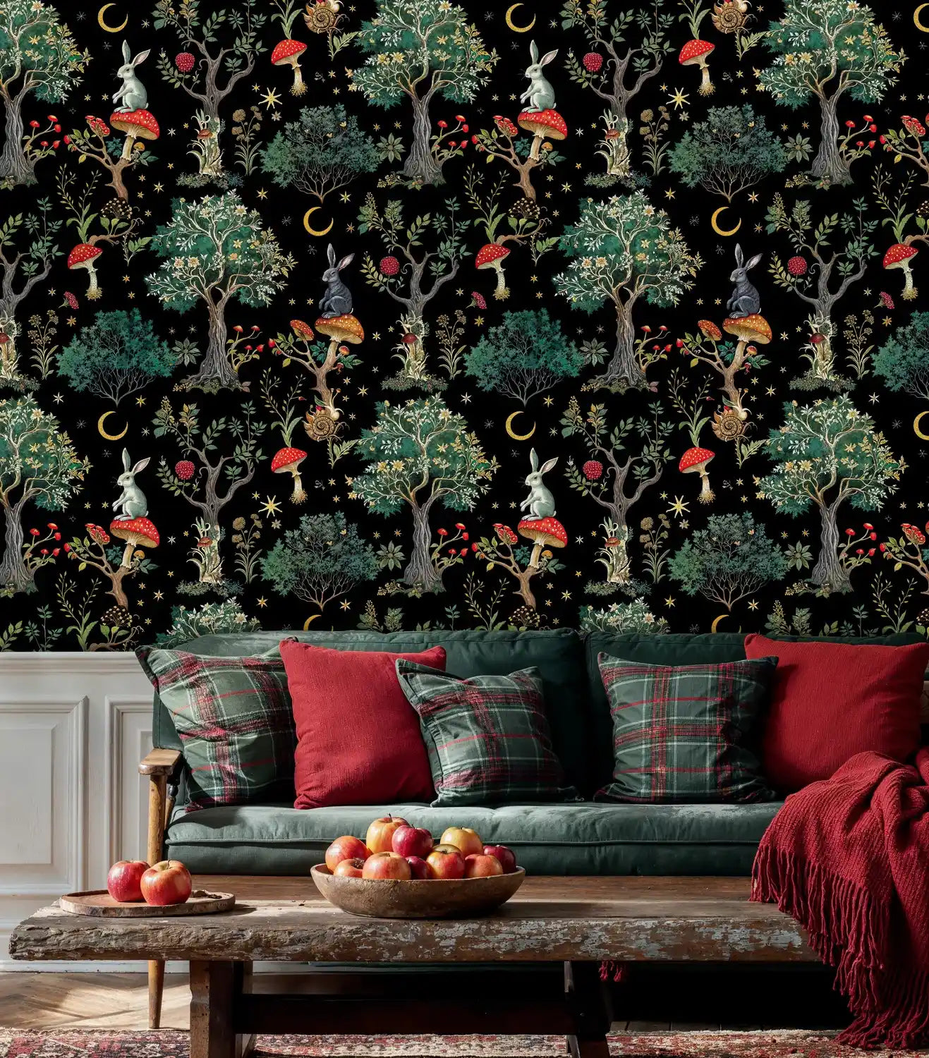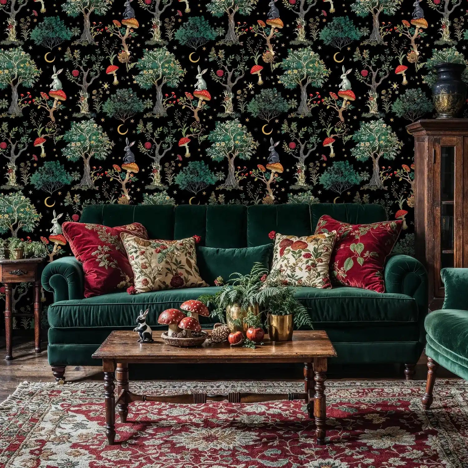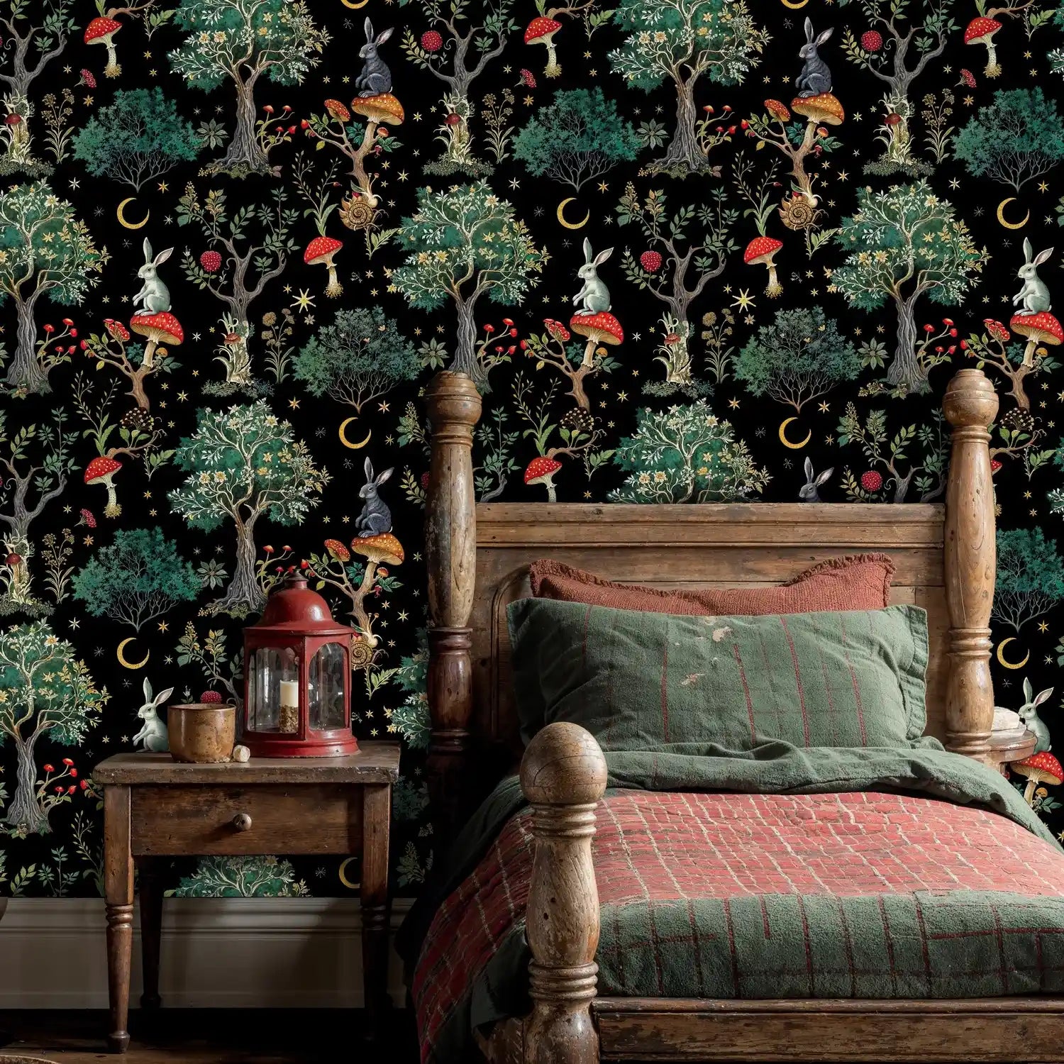 Step into an enchanted realm where whimsical rabbits perch atop vibrant red mushrooms beneath a starlit canopy. This captivating Wallpaper by Atelier Merien draws inspiration from folklore illustrations and fairytale tapestries, weaving together detailed trees, delicate wildflowers, and golden crescents against a rich black backdrop. Each element tells a story of woodland magic, creating an atmosphere that transforms any room into a sanctuary of wonder and imagination.