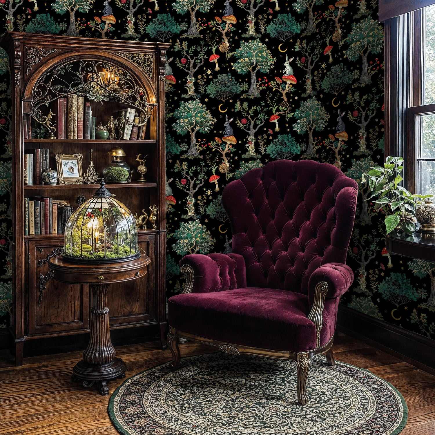 This design works beautifully in reading nooks, bedrooms, or dining spaces where you want to foster imagination and warmth. Pair with rich jewel tones, natural wood furniture, and vintage brass accents to enhance the magical forest atmosphere. The dark background makes spaces feel intimate and cozy while the colorful elements prevent it from feeling too dramatic.