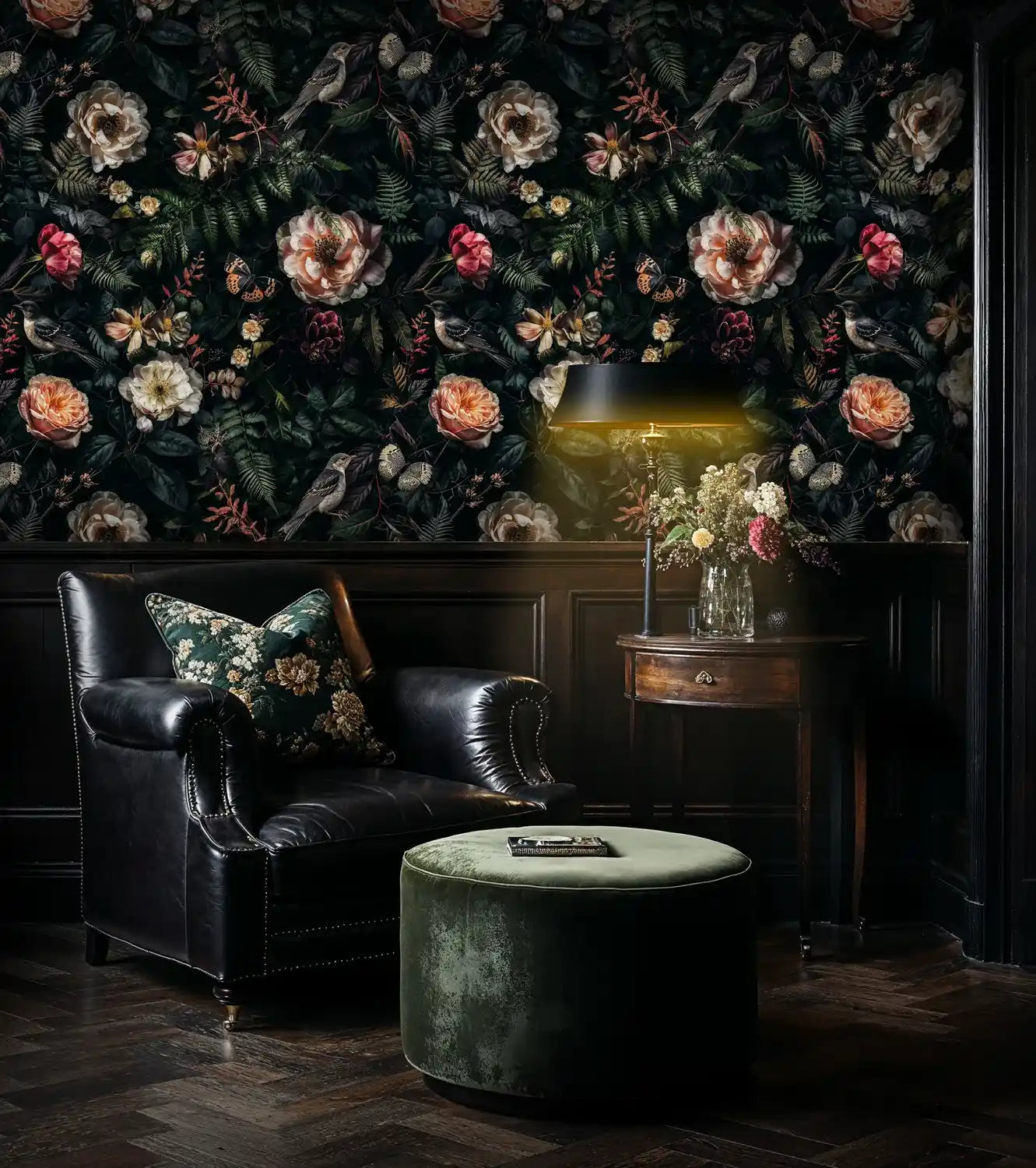 Twilight settles across a secret garden: velvety leaves overlap like theater curtains while opulent blossoms open with a soft glow. Between fronds, songbirds pause and butterflies drift, creating a living still life that feels both romantic and wild. Inspired by fine-art floral photography and layered botanical illustration, this Wallpaper invites a mood of quiet drama and understated luxury. Its dark ground lets petals and feathers glow, giving your room the ambience of a curated gallery. Designed by Atelier Merien, it balances lush detail with refined restraint, making it effortless to style from modern classic to maximalist spaces.
