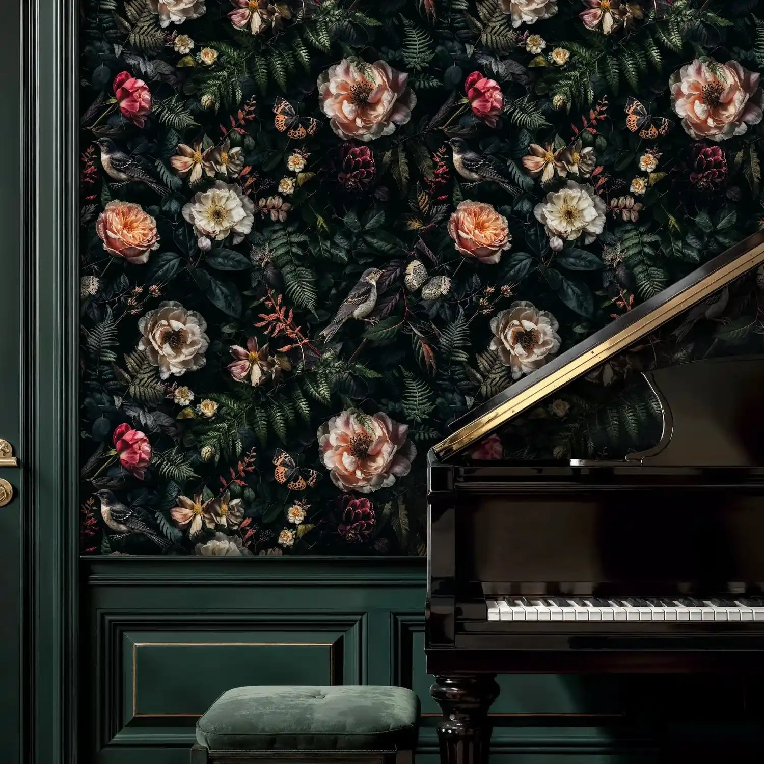Layered botanicals, painterly petals, and lifelike feather textures are arranged over a rich charcoal ground for a moody, immersive look. The composition mixes wild garden blooms, ferns, butterflies, and perched birds to create a refined statement that reads like a framed work of art at scale.