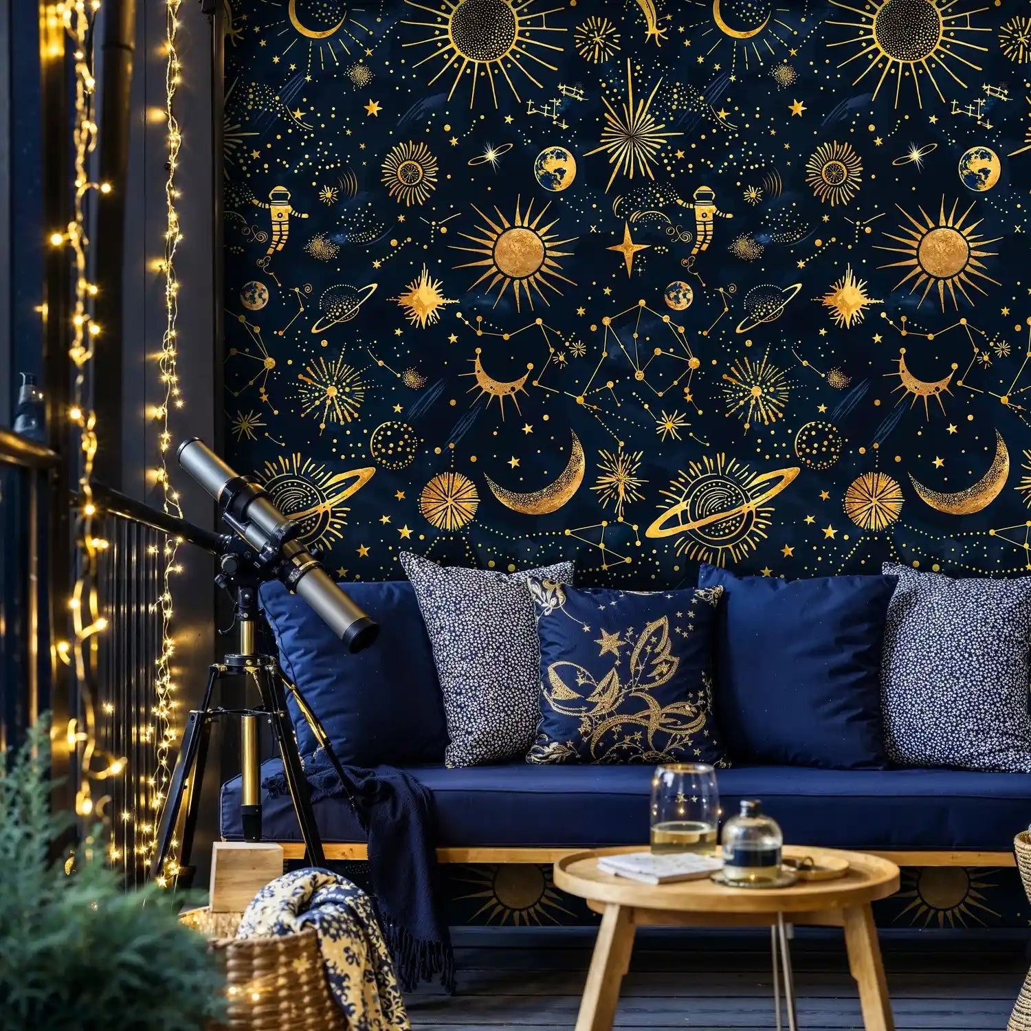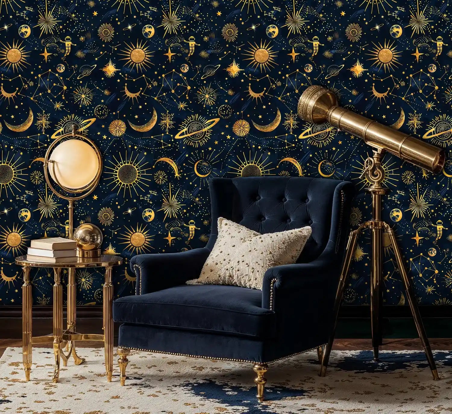 Lean into the celestial mood with dark woods, brass lighting, and midnight blue upholstery, or brighten the scene with ivory textiles and mirrored accents. Complementary decor such as telescopes, globe art, or star-studded cushions enhances the theme without competing with the pattern.