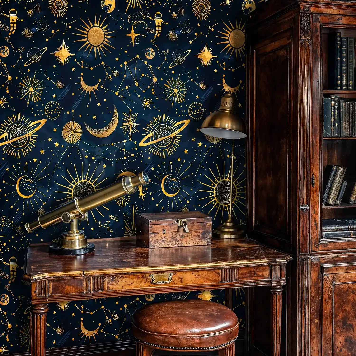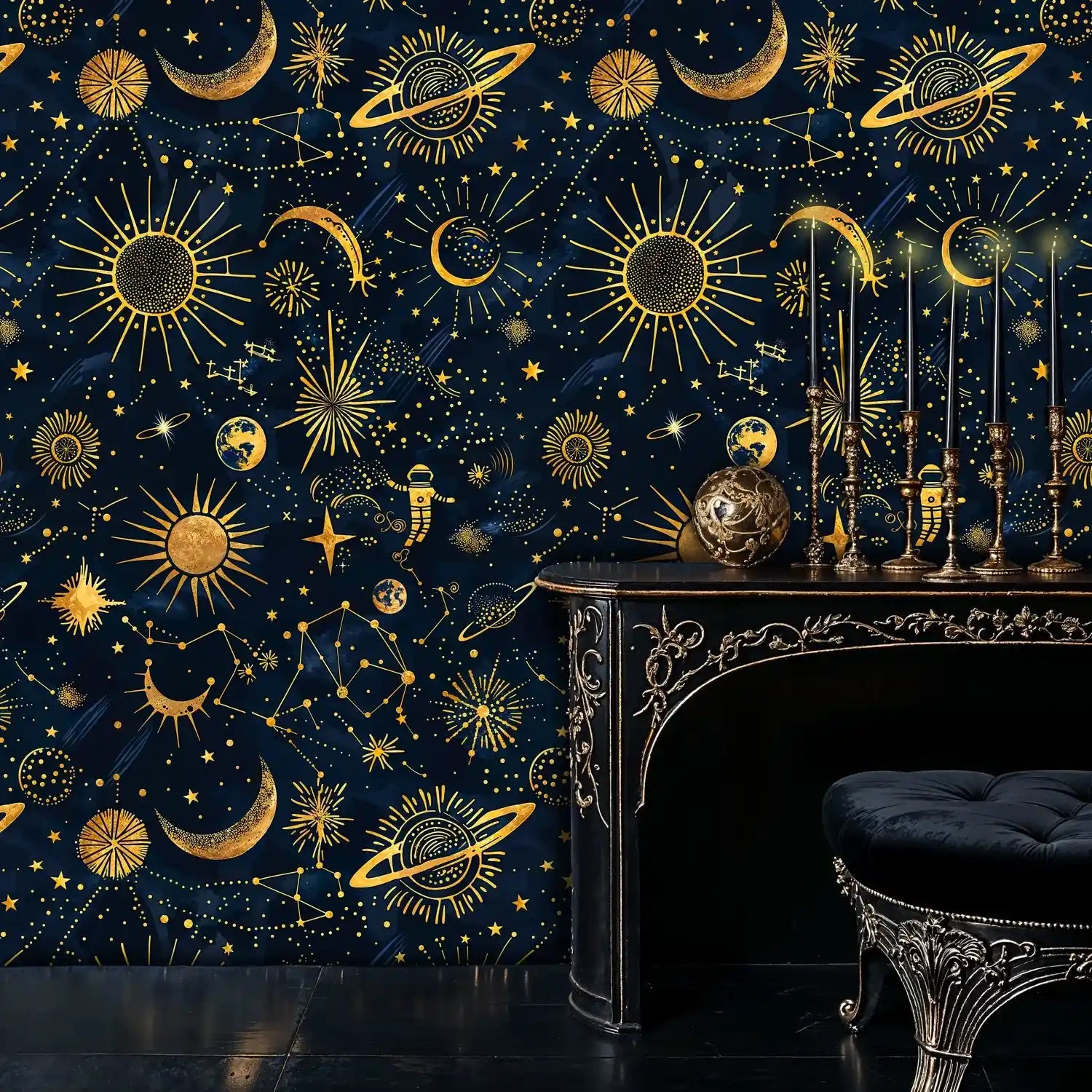 Sunbursts, moons, and planets are rendered with delicate linework and dotted halos, linked by constellations that sweep across a velvety navy sky. The gilded illustrations create a refined sparkle that reads luxurious up close and mesmerizing from afar, making this design ideal for feature walls or full-room installations.
