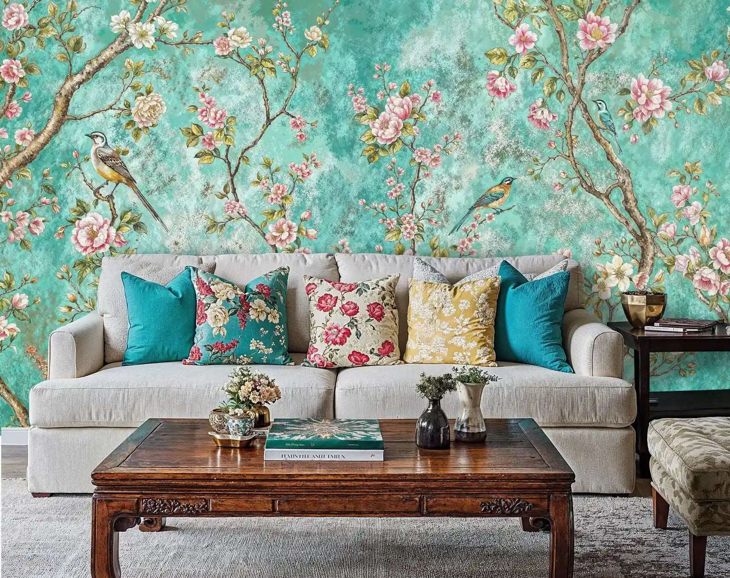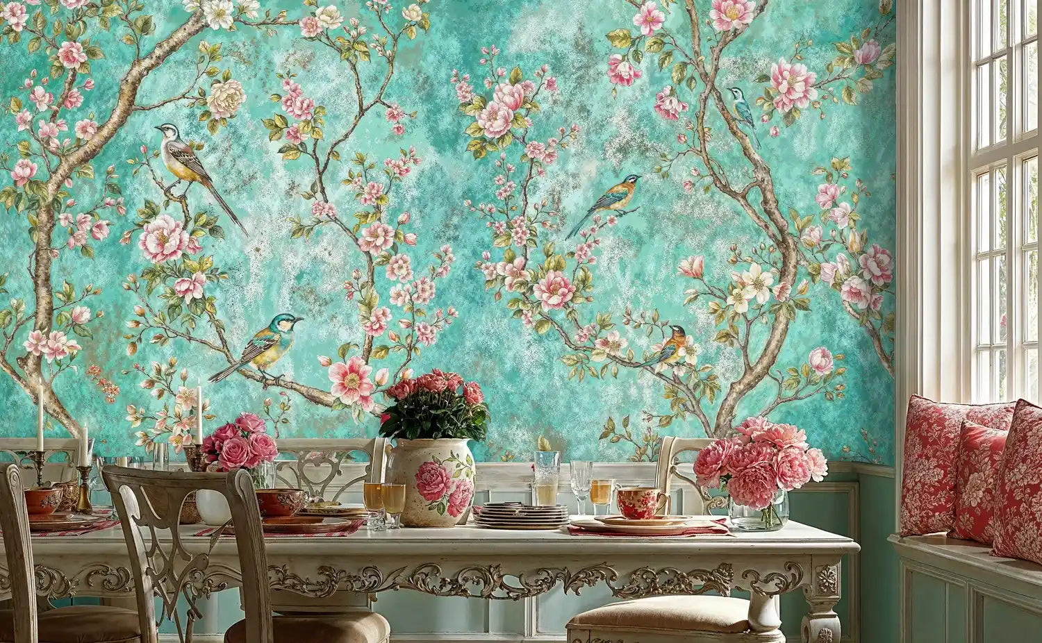 Step into a world where delicate songbirds perch among blossoming branches against an enchanting turquoise sky. This exquisite Wall Mural captures the timeless elegance of traditional chinoiserie artistry, where every brushstroke tells a story of natural beauty and refined sophistication. Inspired by classical botanical paintings, this design brings the serene atmosphere of a blooming garden directly into your home. Atelier Merien has carefully crafted this piece to evoke feelings of tranquility and wonder, creating a space where nature's poetry unfolds across your walls.