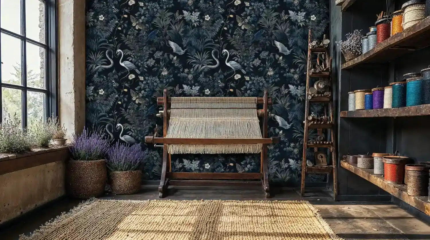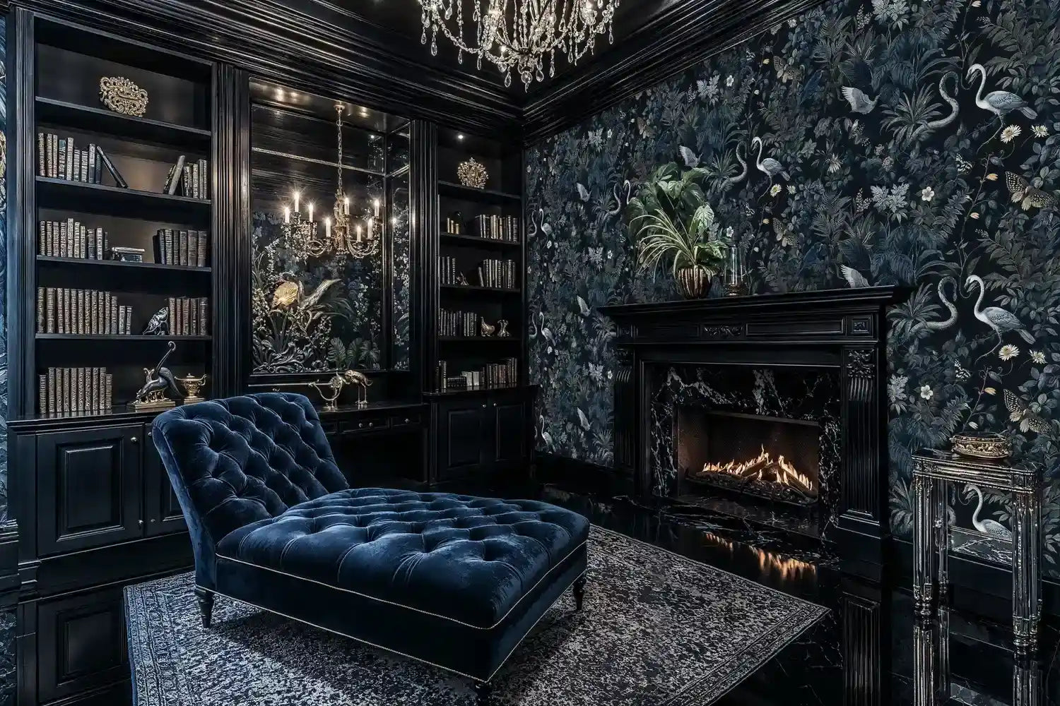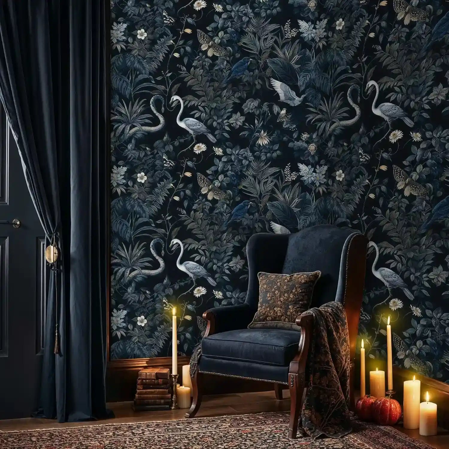 Use this moody bird wallpaper to anchor a living room, library, or home office with quiet luxury. The navy and grey palette grounds bright metals and warm woods, while the flowing pattern softens architecture and creates a refined, cocooning atmosphere.