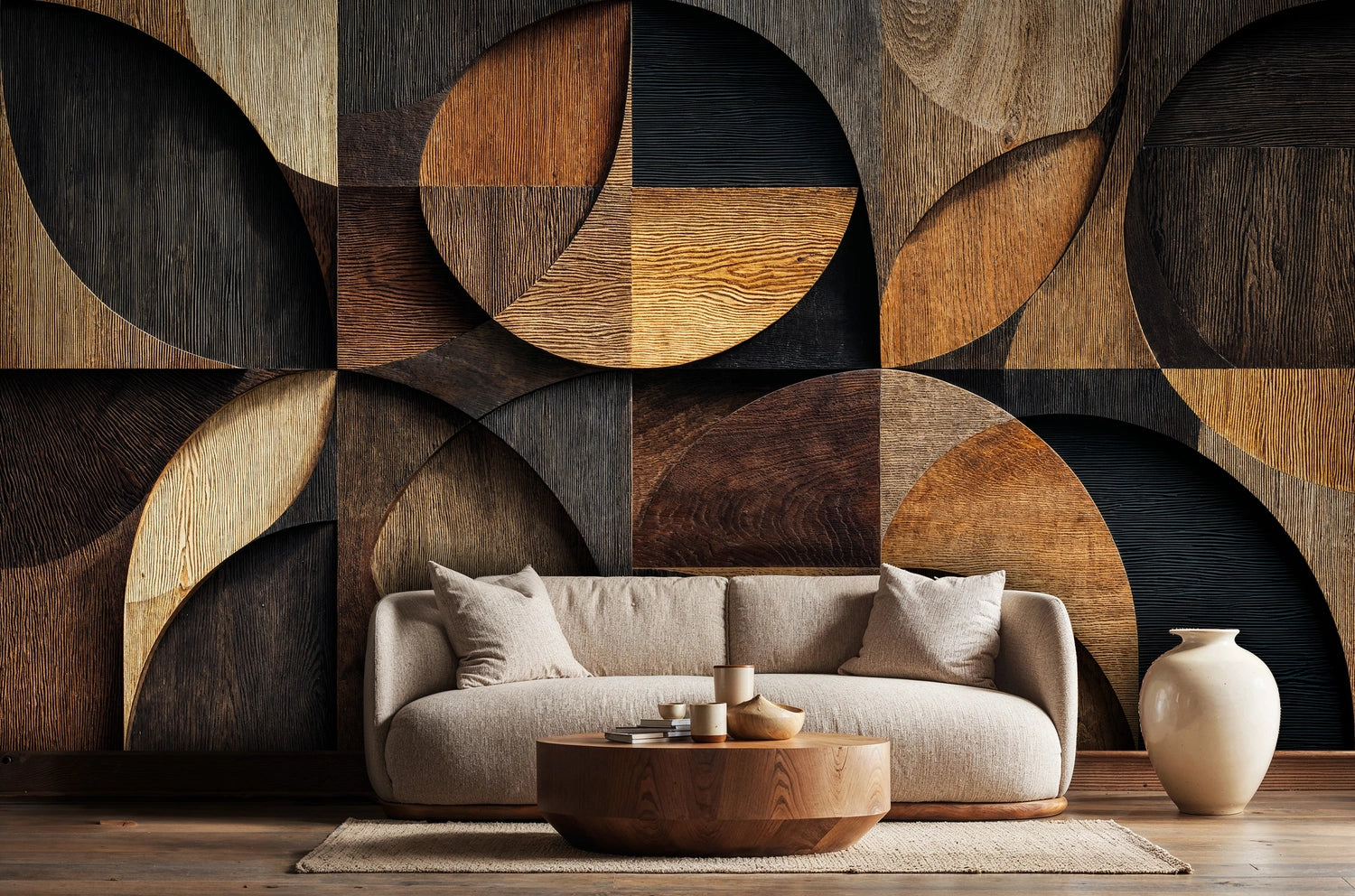 Step into a world where modern geometry meets the timeless beauty of natural wood grain. This striking Wall Mural captures the essence of contemporary design through its bold circular motifs and rich wood textures, creating a sophisticated focal point that speaks to both warmth and precision. Inspired by architectural elements and the organic patterns found in nature, this design from Atelier Merien brings together the best of both worlds - the structured elegance of geometric forms and the authentic character of wood grain.