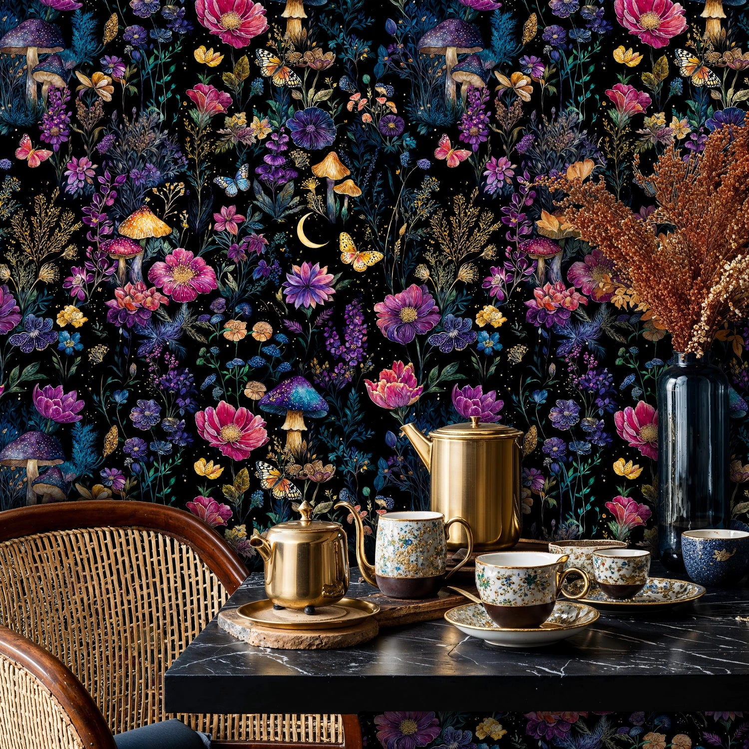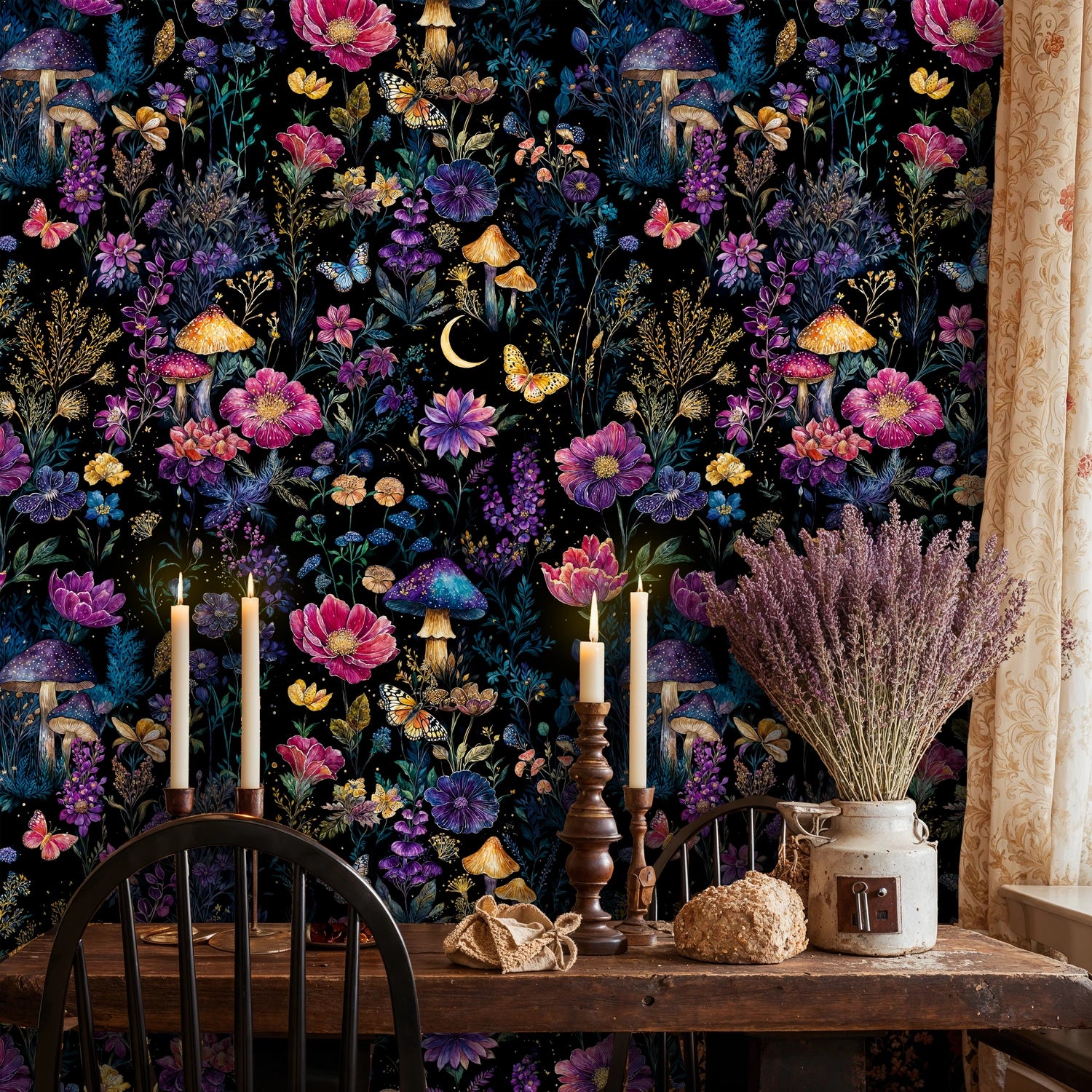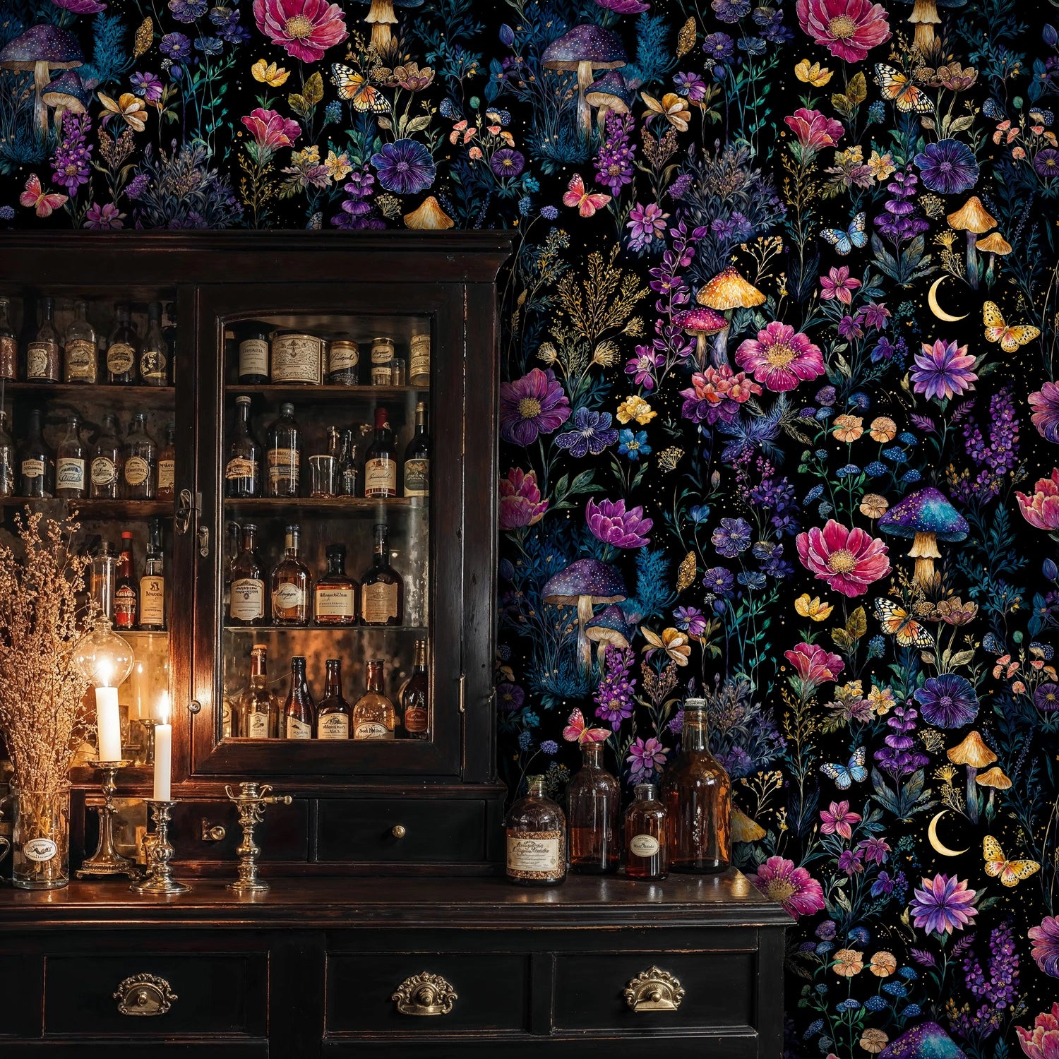 Step into a world where moonlit gardens come alive with ethereal beauty. This enchanting Wallpaper captures the magic of a midnight botanical paradise, where vibrant wildflowers bloom alongside whimsical mushrooms under a starlit sky. Inspired by folklore illustrations and botanical watercolor artistry, this design brings the wonder of an enchanted forest directly to your walls. Atelier Merien has crafted this piece to evoke the serene mystery of nocturnal nature, creating an atmosphere of tranquil sophistication in any room.