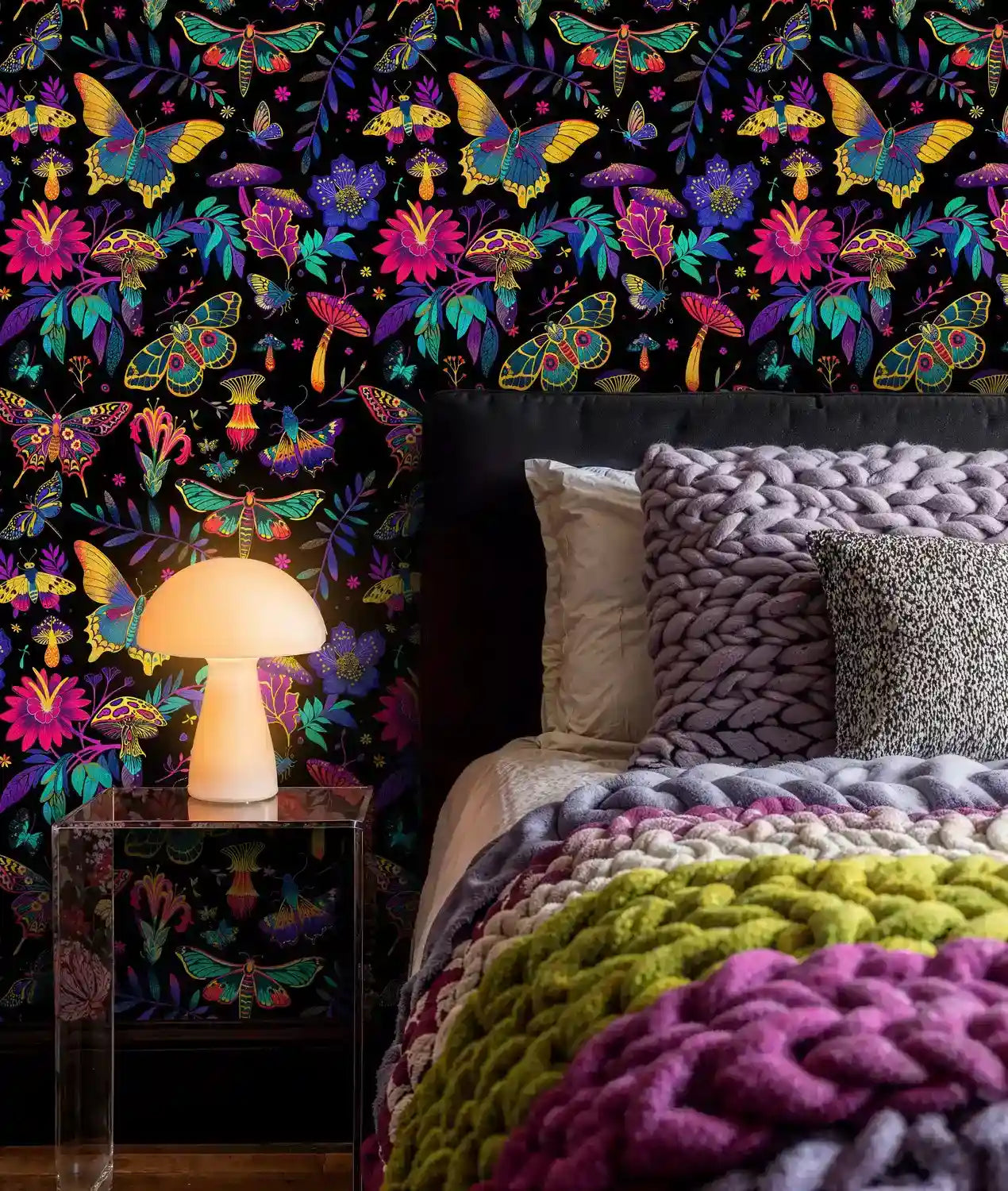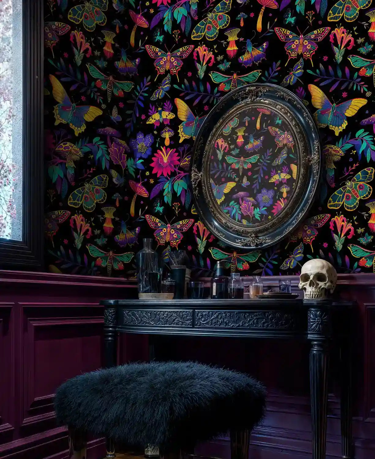 Step into a world where nature's most delicate creatures dance in eternal celebration. This extraordinary wallpaper design captures the mystical beauty of an enchanted butterfly garden, where vibrant moths and butterflies flutter among exotic wildflowers and mystical mushrooms against a rich black backdrop. Inspired by folk art traditions and botanical illustrations, this Atelier Merien creation brings the magic of a midnight garden into your home, transforming any room into a captivating sanctuary of natural wonder.