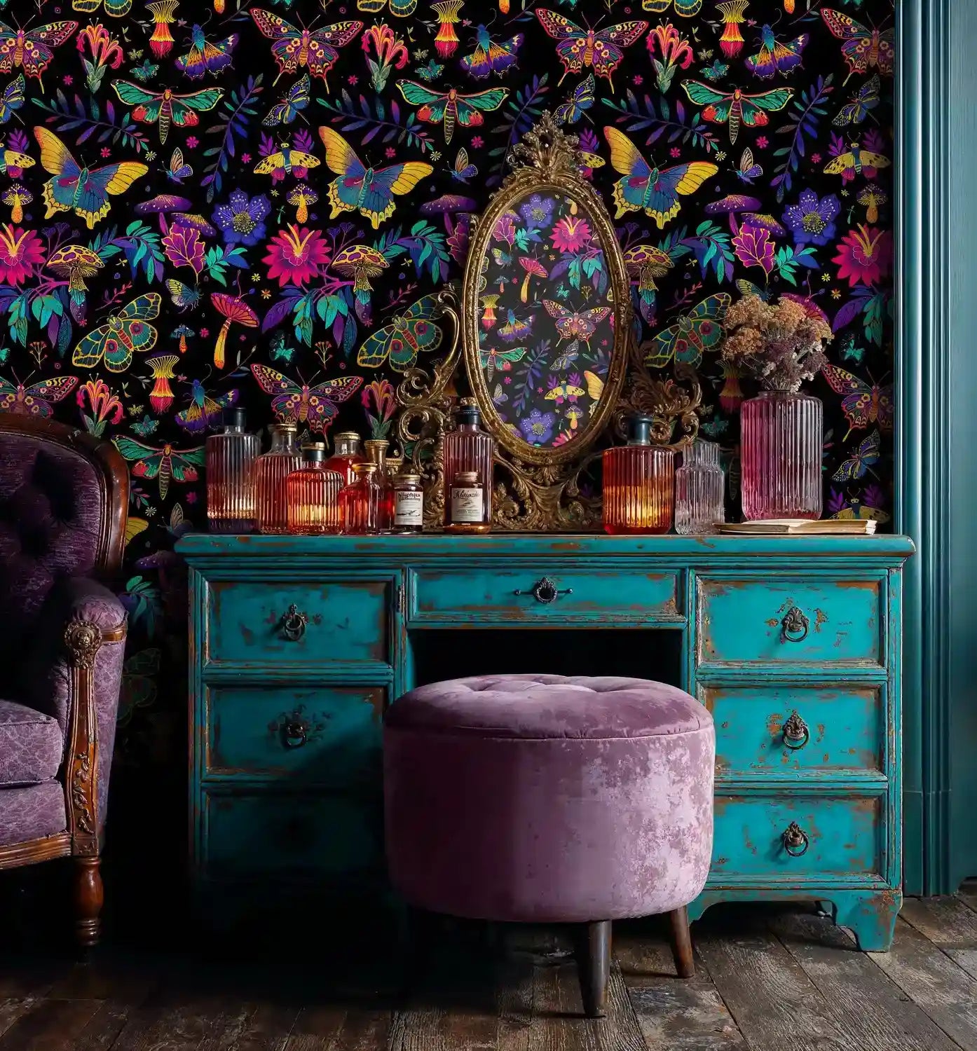 This design thrives in spaces that celebrate creativity and individuality. Whether adorning a bedroom for dramatic flair, creating a stunning dining room backdrop, or adding personality to a powder room, this wallpaper pairs beautifully with rich textures, metallic accents, and both modern and vintage furnishings.