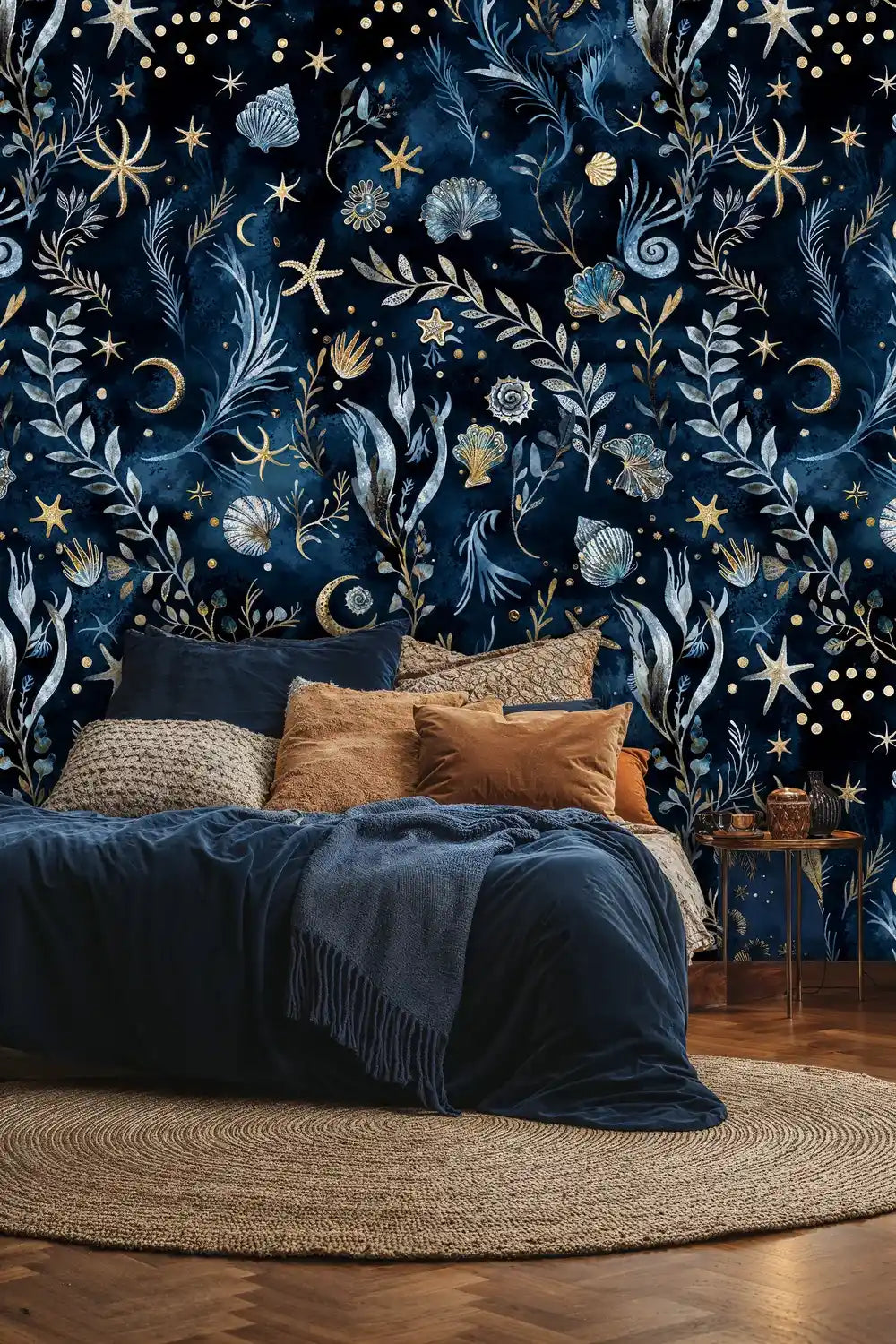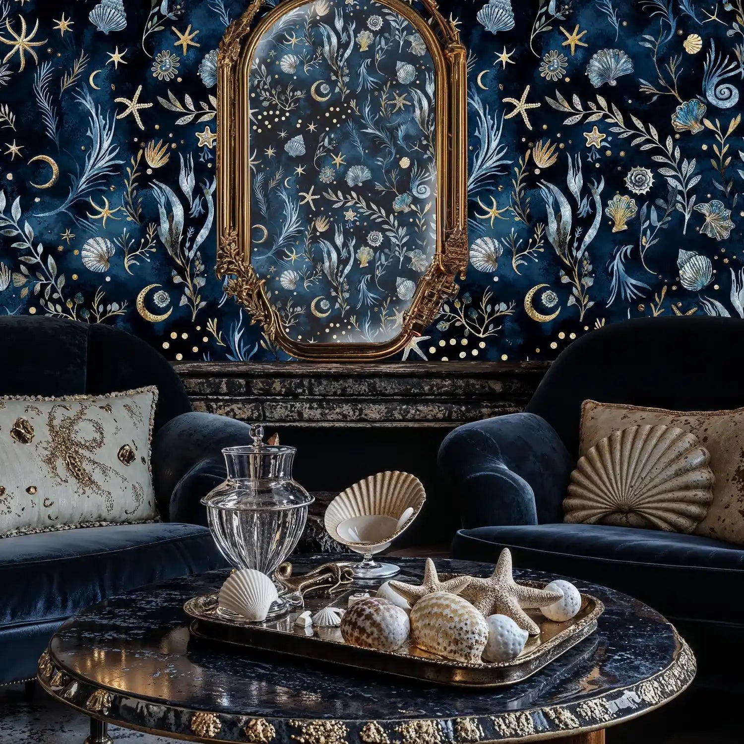 Imagine the hush of a night tide as constellations glimmer over deep water. This celestial ocean Wallpaper drifts with shells, starfish, and graceful fronds, painted in inky blues with glints of gold that catch the eye like sea-sparkle. Inspired by poetic shorelines and dreamlike sky maps, it sets a mood of calm opulence and quiet wonder. Designed by Atelier Merien, the artwork layers painterly textures and fluid movement so your space feels immersive, as if you’re floating beneath a starlit surface where sea life and the moon share the same horizon.