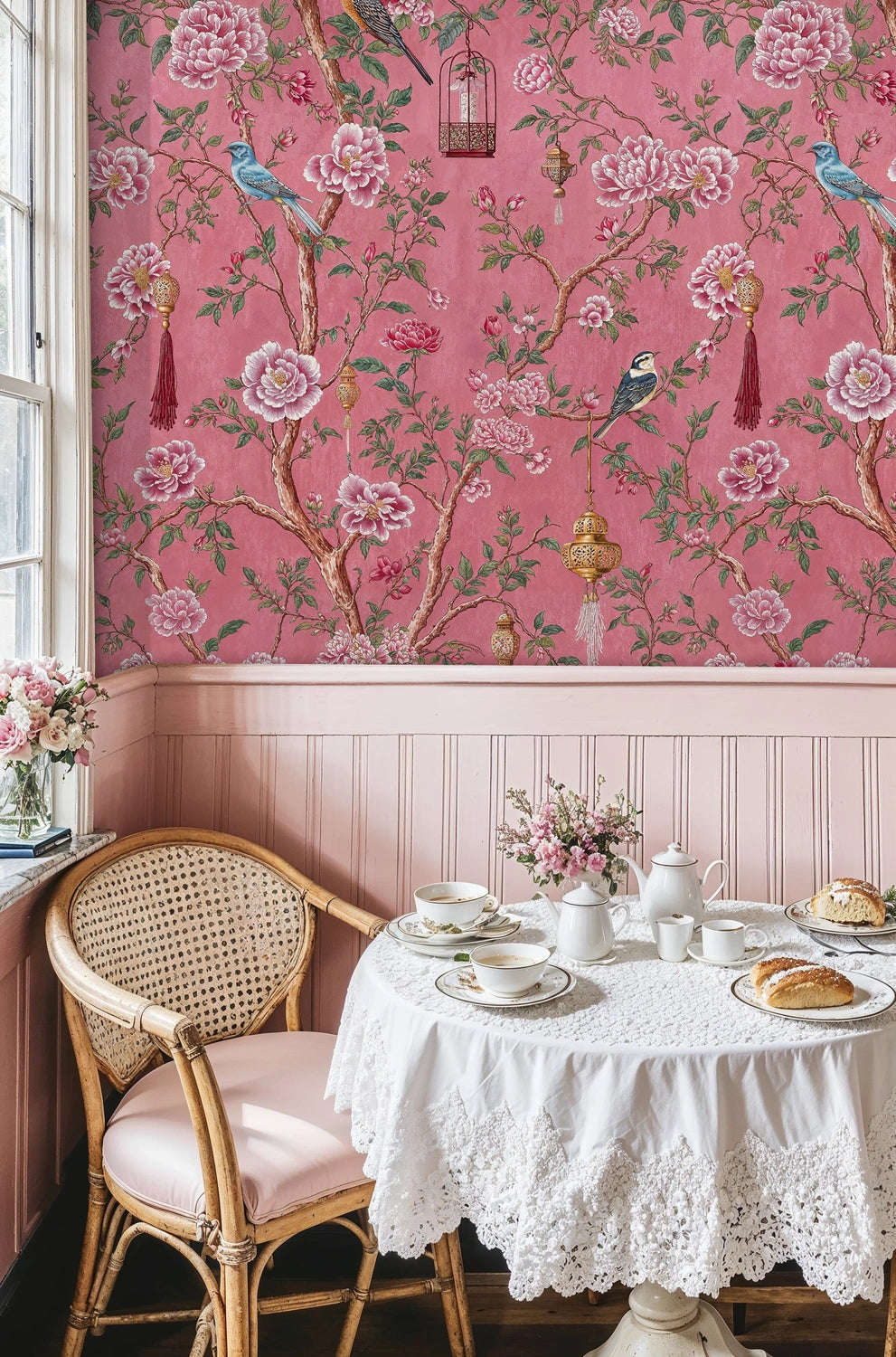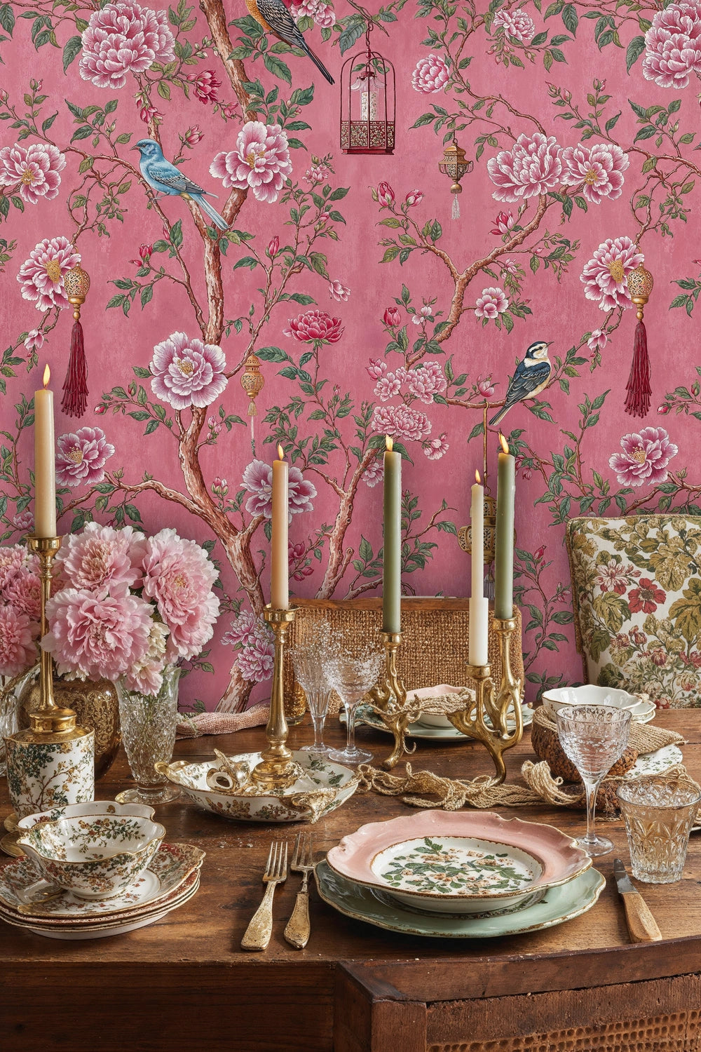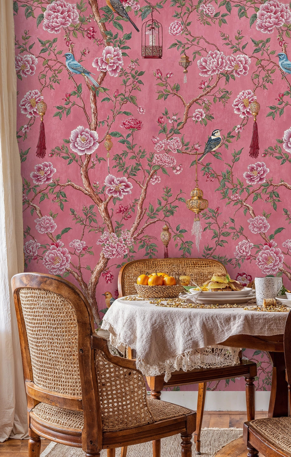 Step into a world where delicate songbirds dance among blooming peonies and ornate lanterns cast a gentle glow through your living space. This exquisite Wallpaper draws inspiration from classical chinoiserie artistry, where nature's most beautiful elements intertwine in perfect harmony. The graceful branches weave stories of tranquility and elegance, while vibrant birds perch amongst full-bloomed flowers, creating an atmosphere of serene luxury. Atelier Merien presents this masterpiece as more than decoration—it's an invitation to live within art itself.