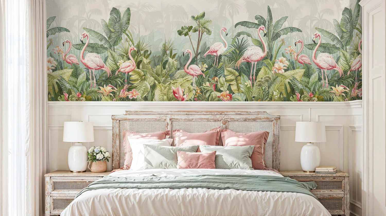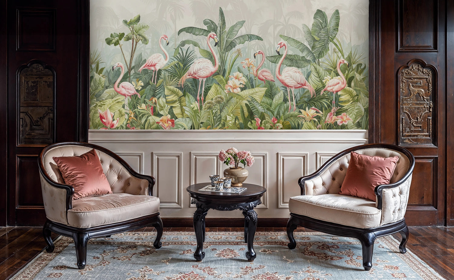 Step into a world where vibrant pink flamingos wade through an emerald jungle sanctuary. This magnificent Wall Mural captures the essence of tropical elegance, featuring graceful flamingos nestled among lush banana leaves, delicate hibiscus blooms, and exotic foliage. Inspired by the natural beauty of tropical landscapes and botanical illustration artistry, this design brings the serene luxury of a private resort directly to your walls. Atelier Merien's masterful attention to detail creates an immersive experience that transforms any room into a sophisticated escape.