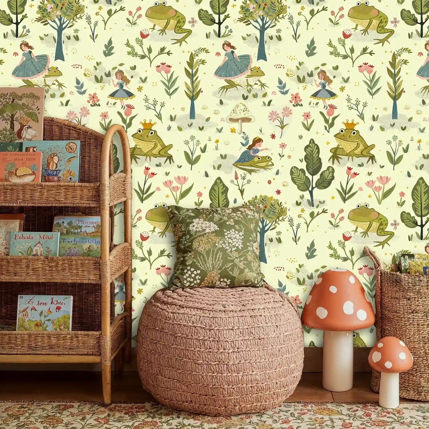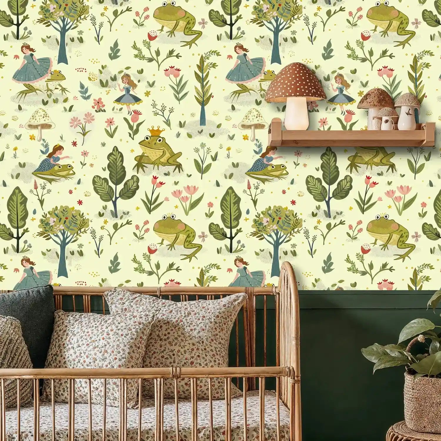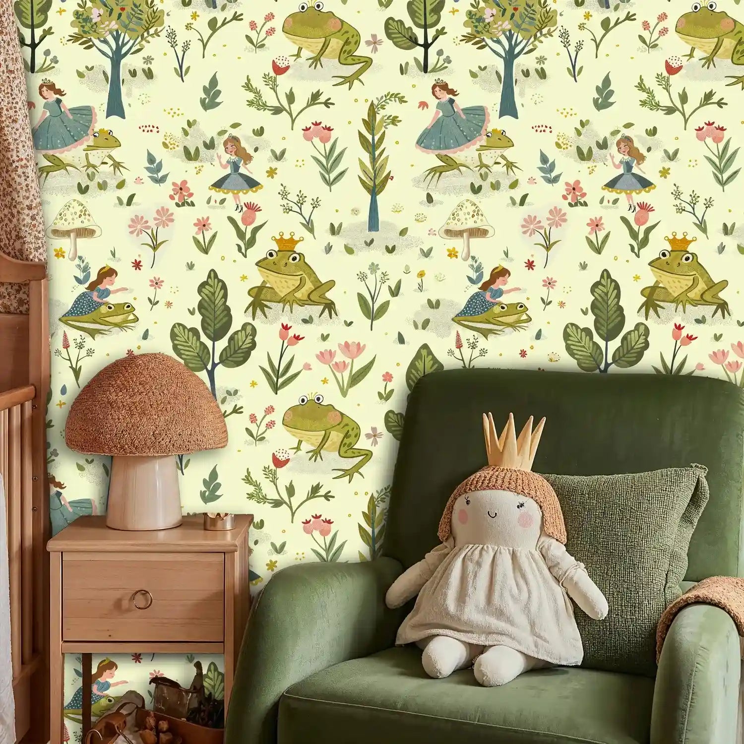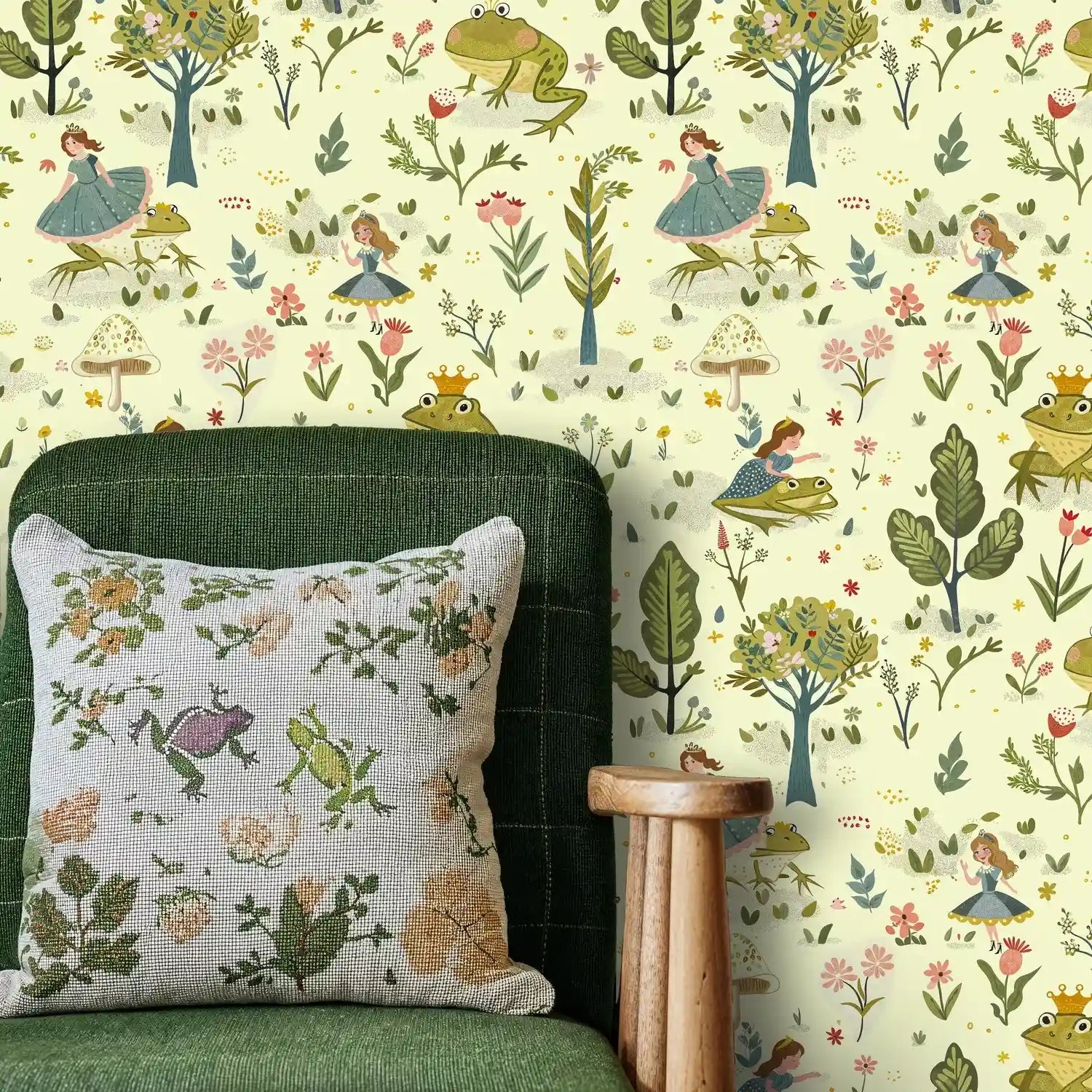 Step into an enchanted world where fairy tale dreams come alive on your walls. This delightful wallpaper captures the magic of beloved children's stories, featuring charming princesses dancing alongside friendly frogs in a botanical wonderland. Inspired by classic storybook illustrations, this design by Atelier Merien brings the gentle beauty of hand-painted watercolor artistry to your space, creating an atmosphere of wonder and imagination that will spark countless bedtime stories.