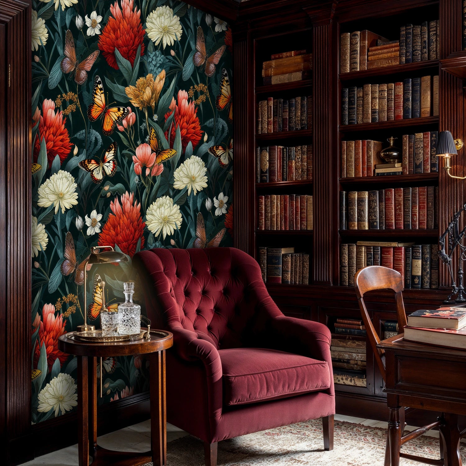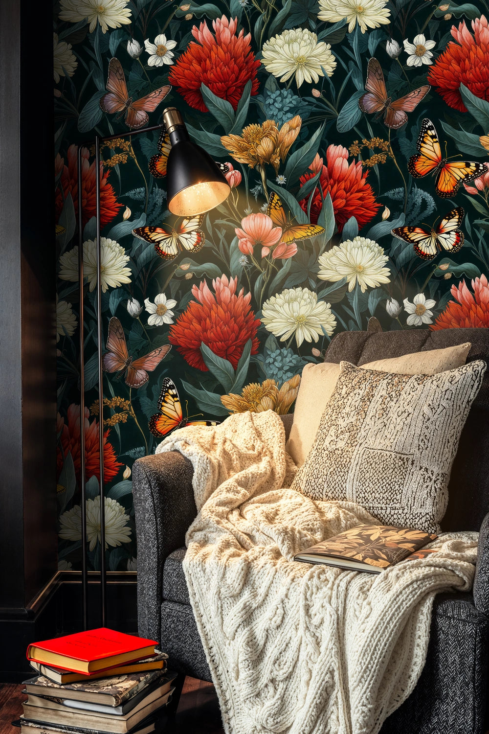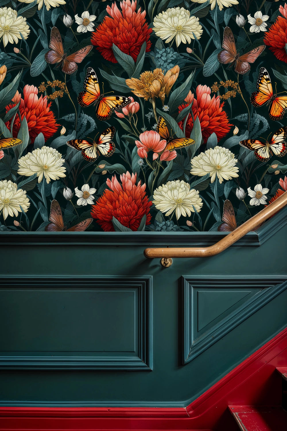Step into a world where nature's most exquisite moments are captured in perpetual bloom. This enchanting Wallpaper from Atelier Merien draws inspiration from the magical convergence of vibrant florals and graceful butterflies, creating a symphony of color and movement that breathes life into any room. Rich coral dahlias dance alongside delicate cream chrysanthemums, while majestic monarch and swallowtail butterflies flutter through an emerald tapestry of lush foliage, transforming your walls into a living masterpiece.