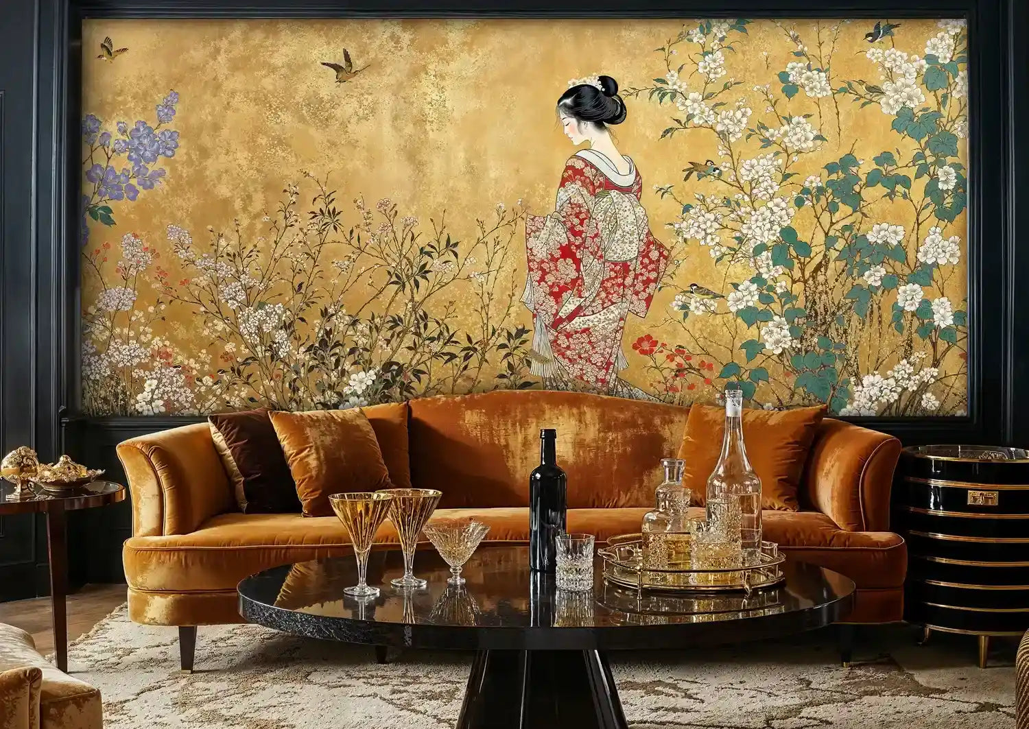 Use this statement mural to anchor a bedroom, dining room, or boutique lounge. The luminous ground reflects ambient light, while the serene figure and flowering branches cultivate calm. Style with low-profile furniture, natural wood, black lacquer details, or velvet seating to echo its refined, Asian-inspired mood and create a gallery-like focal wall.