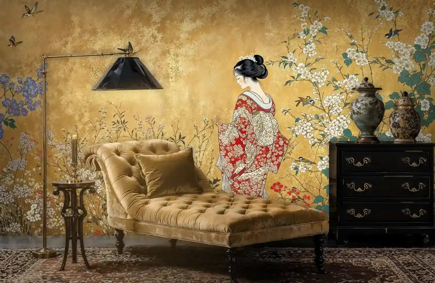 Fine linework traces blossoms, birds, and the flowing kimono while mottled gold textures create depth reminiscent of hand-applied leaf. The palette of gold, ivory, teal green, and touches of red ensures the mural reads luxurious yet balanced. This Japanese garden wall mural becomes a living artwork, rewarding close viewing with intricate petals, delicate feathers, and subtle shading.