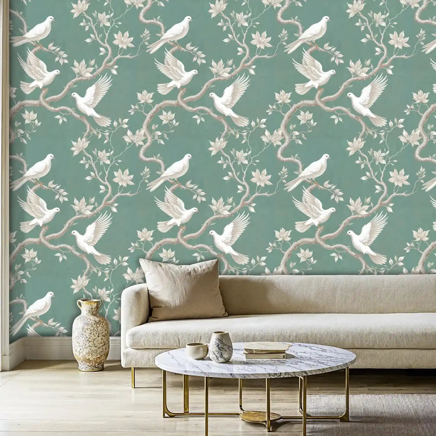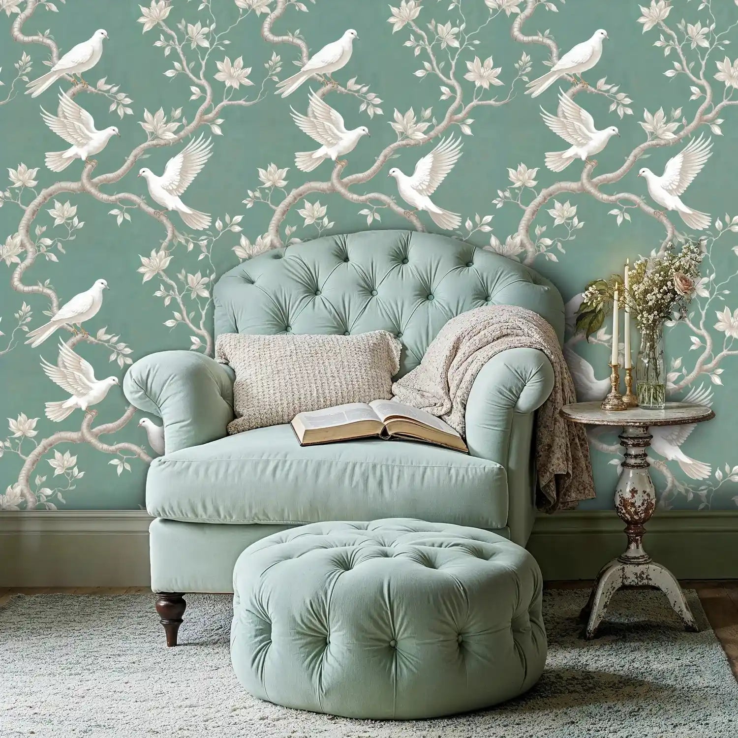 - The wallpaper features a sophisticated sage green background with crisp white doves and cream-toned magnolia branches. The subtle beige details in the branches add warmth, while the overall palette remains calm and versatile for various decor schemes.