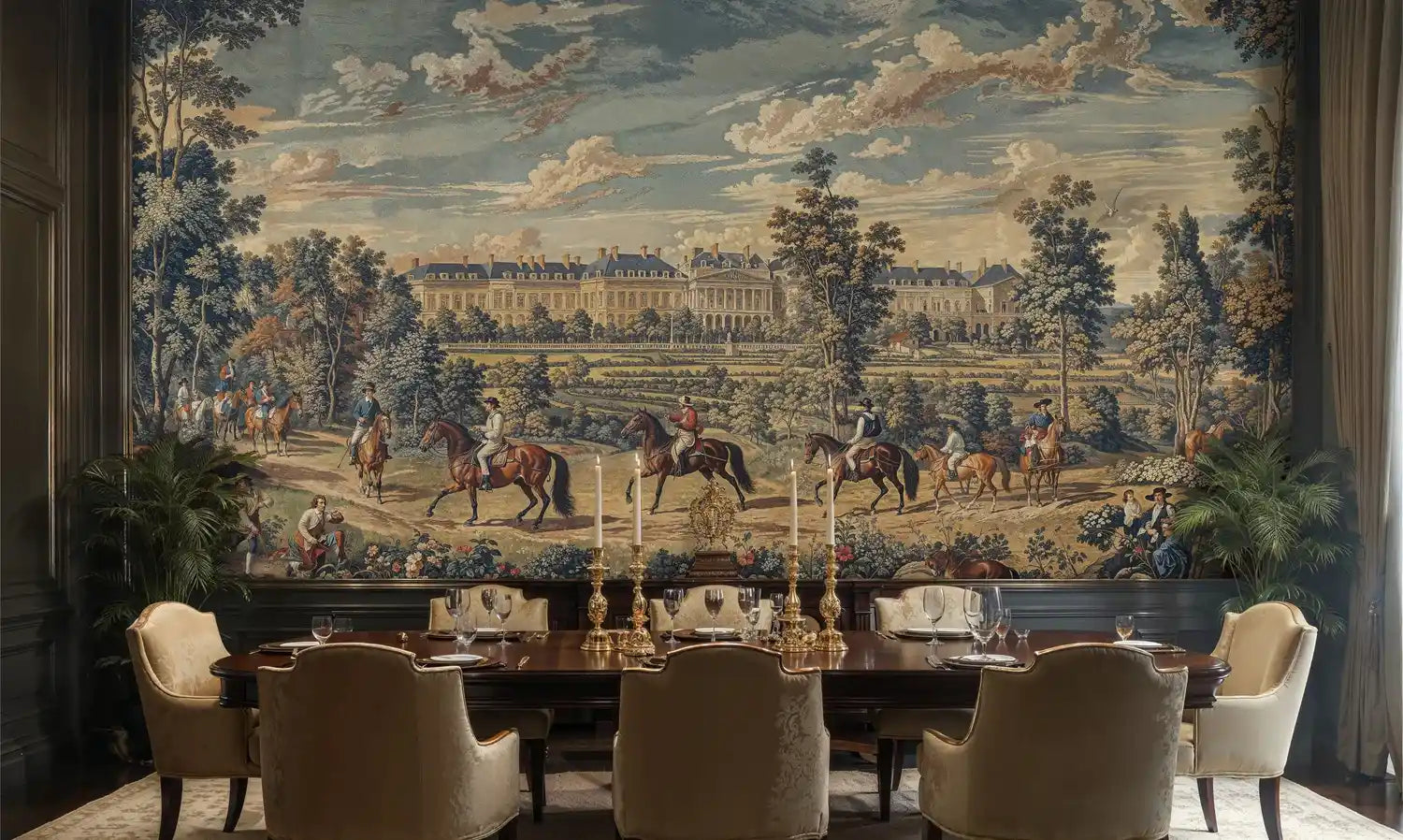Step into a world of timeless elegance with this magnificent countryside tapestry. This Wall Mural captures the essence of pastoral luxury, depicting an enchanting scene where riders traverse through manicured landscapes before a stately manor. Inspired by classical European textile artistry, this design brings the sophistication of grand estate living into your home. Atelier Merien presents this masterpiece as more than wallpaper—it's a portal to refined living and aristocratic charm.