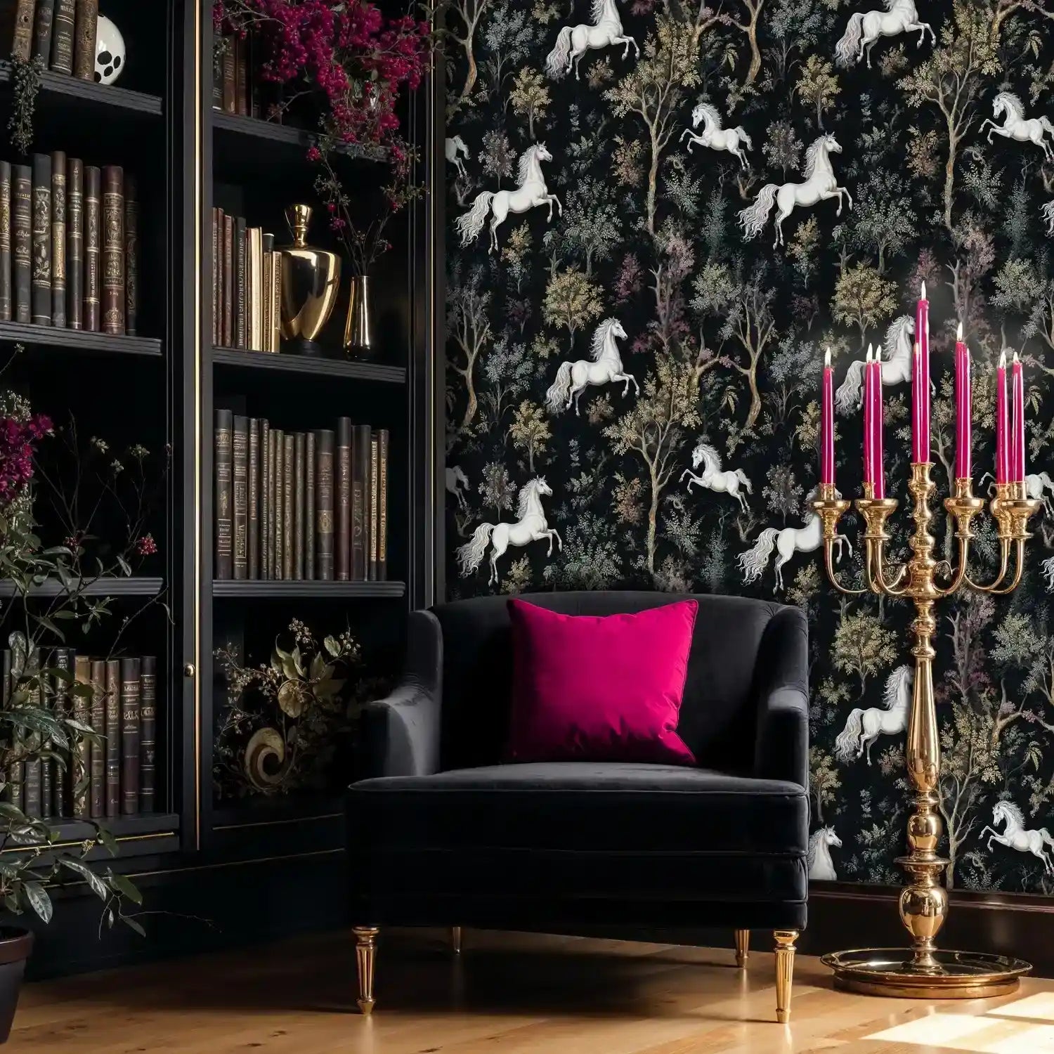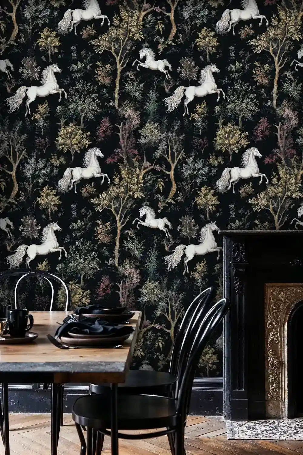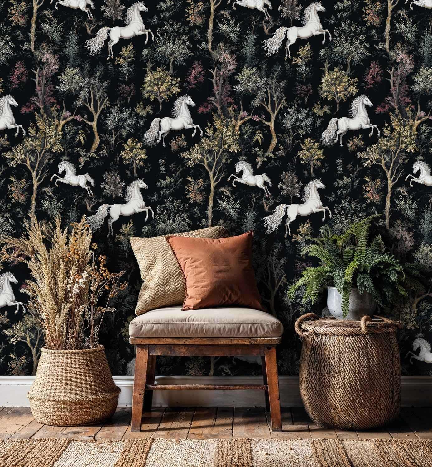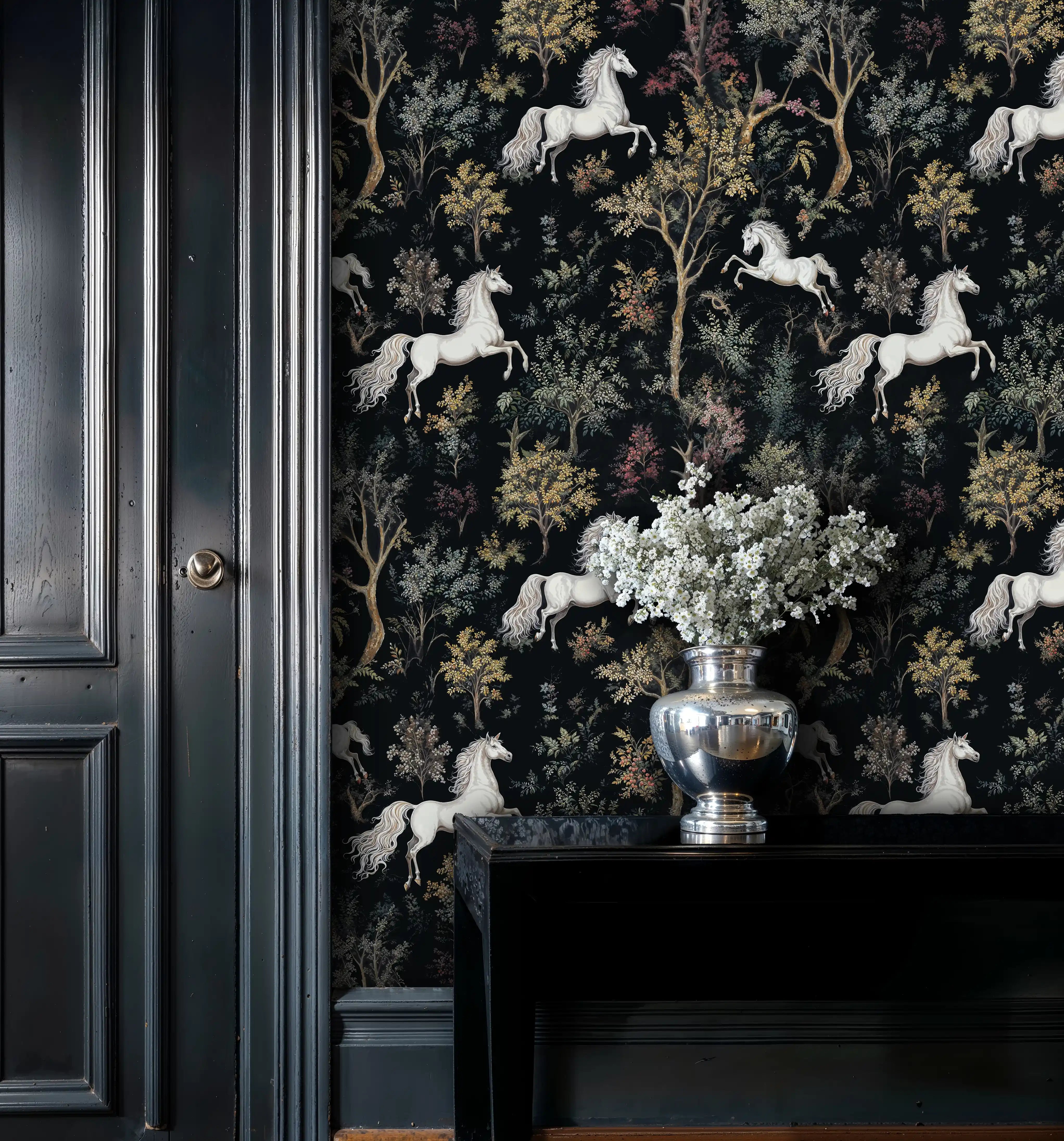 Step into a moonlit grove where graceful white stallions move between painterly trees. This Wallpaper casts a rich, nocturnal backdrop that lets luminous horses and softly tinted foliage shimmer with quiet motion. Inspired by hand-painted storybook art and the romance of night gardens, the design layers delicate branches, misty leaves, and sweeping tails across a deep charcoal base to create a scene that feels both wild and refined. From Atelier Merien, it invites slow evenings, candlelight, and intimate conversation, turning walls into a dramatic canvas. Whether you dress a dining nook or frame a reading corner, the effect is a transportive woodland vignette that suggests adventure without leaving home.