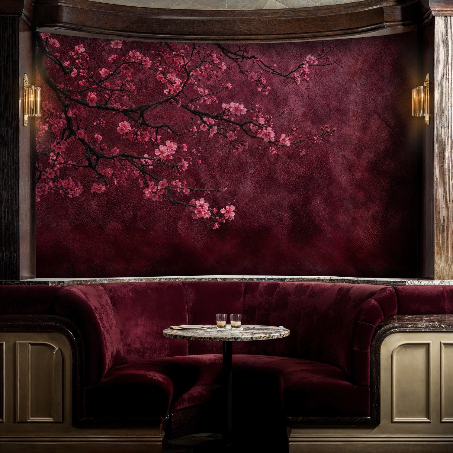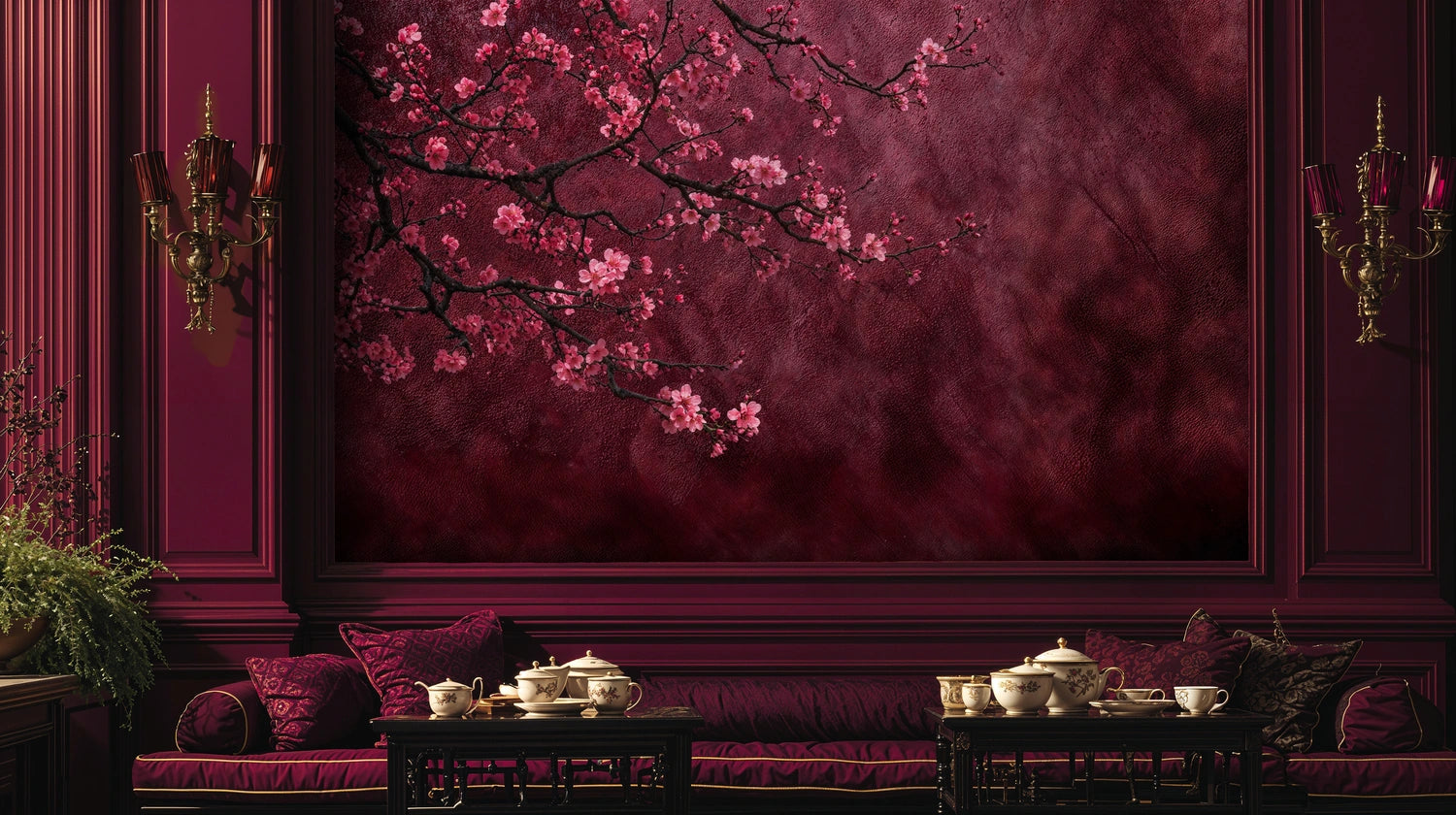 Step into a world where delicate pink cherry blossoms dance against a rich burgundy backdrop, creating an atmosphere of timeless elegance and natural beauty. This exquisite Wall Mural captures the essence of spring's most cherished moment, when nature awakens with gentle grace and poetic splendor. Inspired by traditional botanical artistry and the serene beauty of blooming orchards, this design from Atelier Merien brings a sense of tranquil sophistication to any interior. Each branch tells a story of renewal and hope, while the deep wine-colored background adds dramatic depth that transforms ordinary walls into extraordinary focal points.