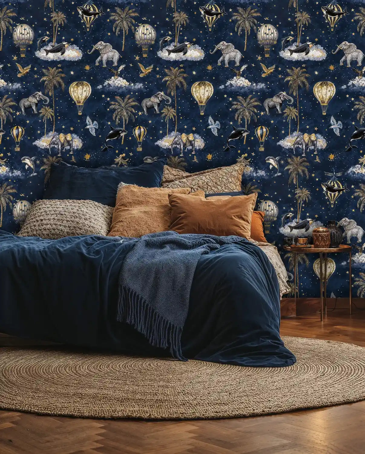 Every element in this design tells a story of adventure and wonder. The intricate details of vintage hot air balloons, gentle elephants adorned with golden bows, and graceful marine life create a rich tapestry that reveals new discoveries with each glance. The careful balance of whimsical subjects against the deep celestial background ensures the design feels both playful and sophisticated.