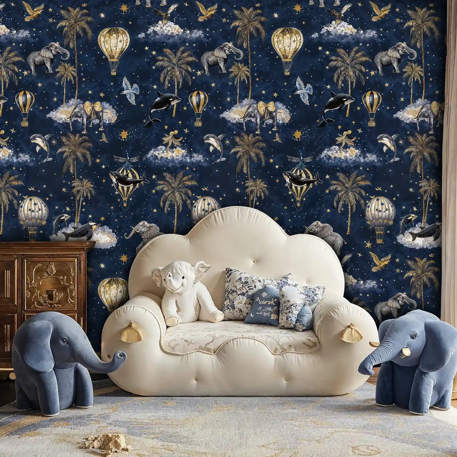 Step into a world where imagination takes flight with this enchanting celestial adventure wallpaper. Inspired by whimsical storytelling and fantastical journeys, this design captures the wonder of floating through starlit skies among gentle giants and soaring dreams. Golden hot air balloons drift alongside majestic elephants riding fluffy clouds, while graceful birds navigate between tropical palms and twinkling constellations. This extraordinary wallpaper from Atelier Merien brings the magic of adventure and the serenity of night skies into your living space, creating an atmosphere of wonder and tranquility.