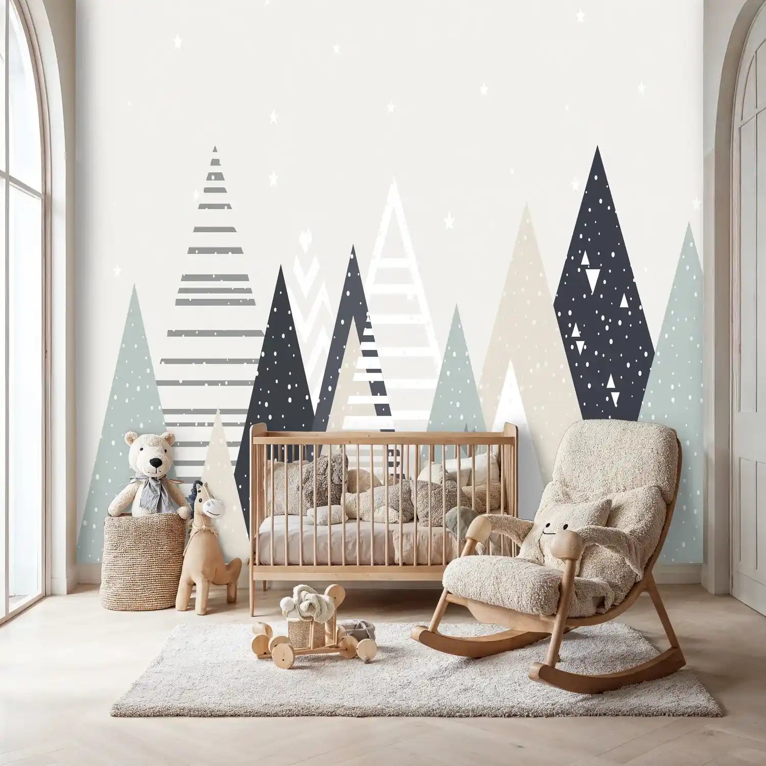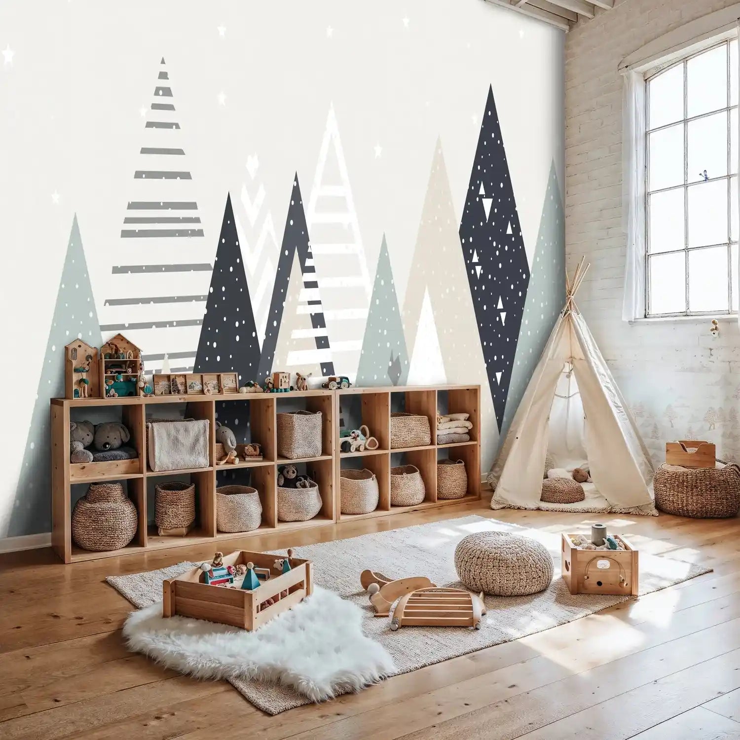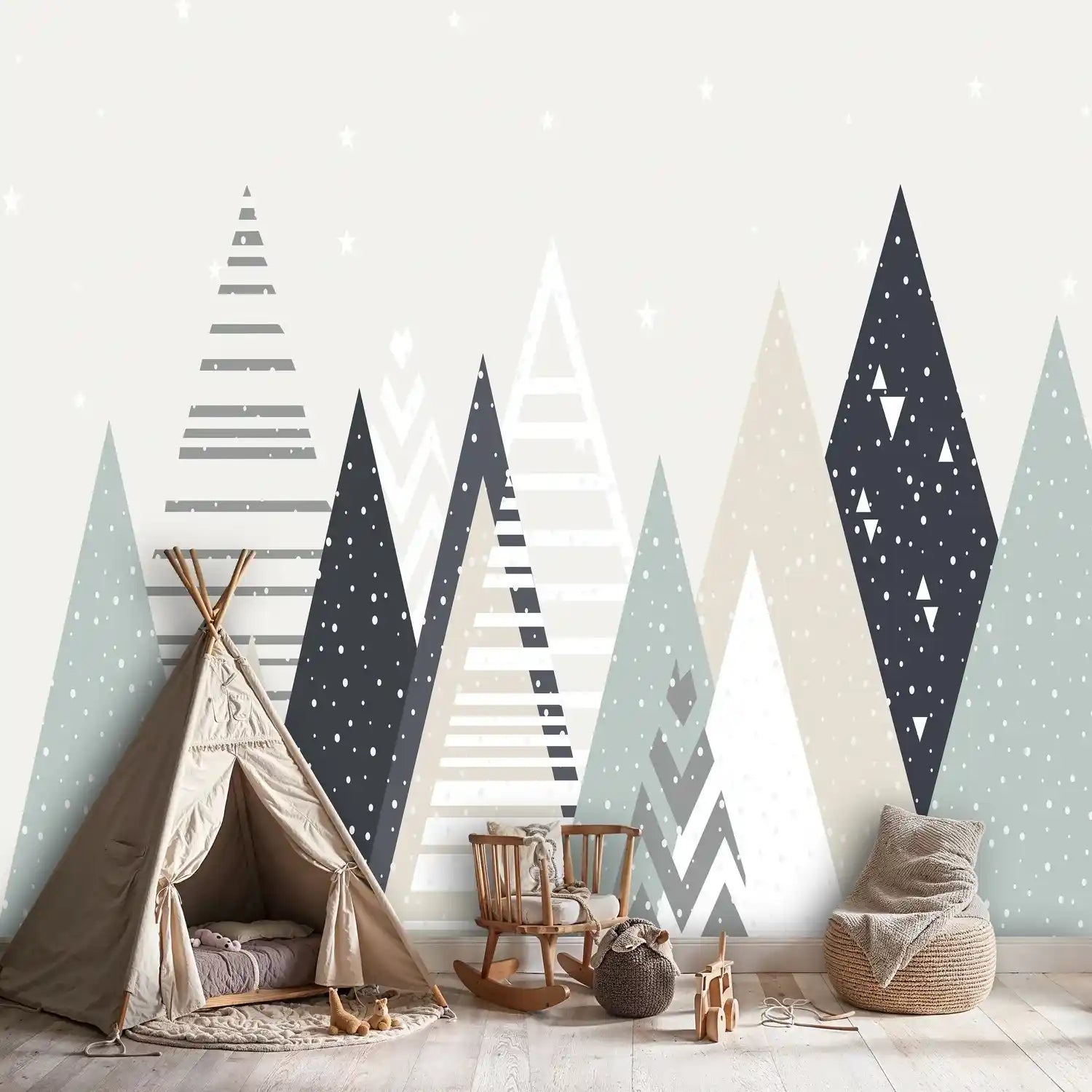 Each geometric mountain tells its own story through intricate patterns and textures. The subtle interplay of dots, stripes, and triangular motifs creates visual depth while maintaining the clean, uncluttered aesthetic that modern homes crave. The design works beautifully as a statement wall or throughout an entire room.