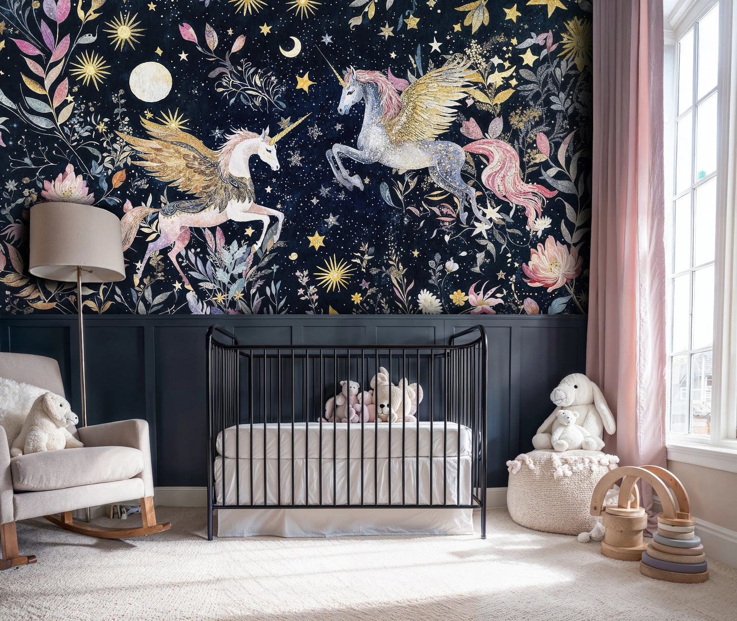 This celestial garden theme pairs beautifully with soft pastels, metallic accents, and natural textures. Whether adorning a feature wall or wrapping an entire room, it creates an immersive environment that encourages creativity and peaceful dreams.