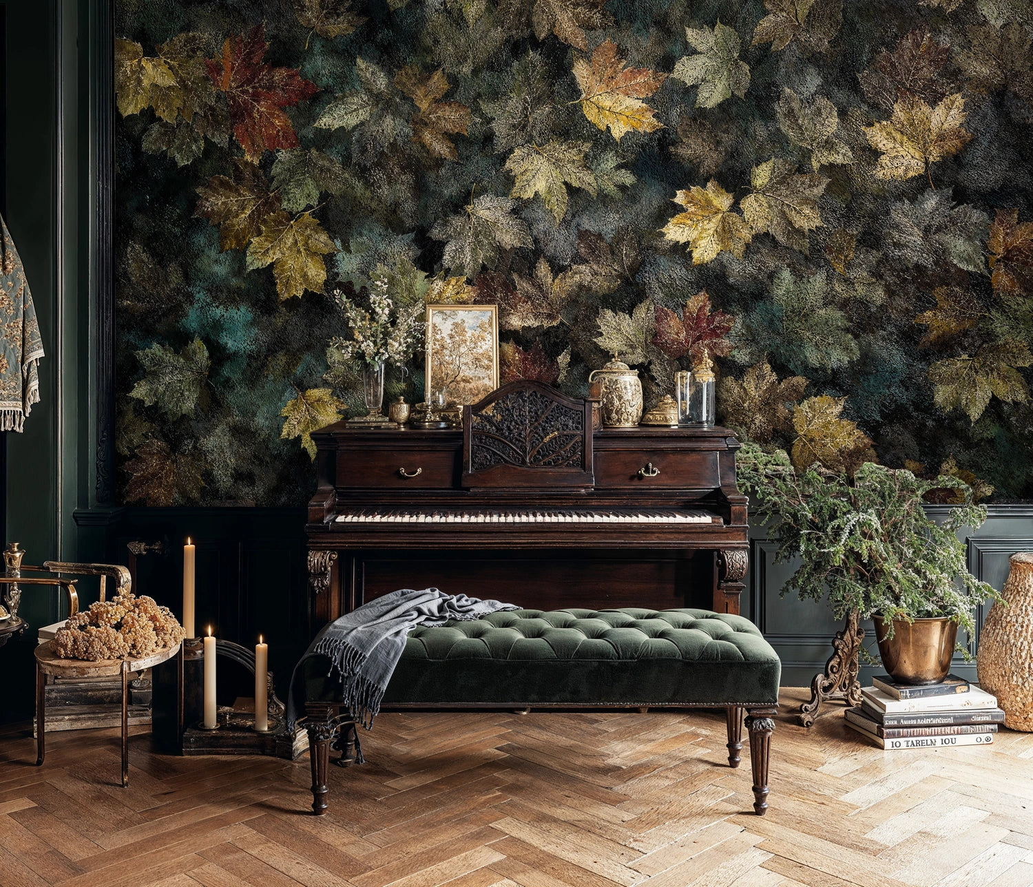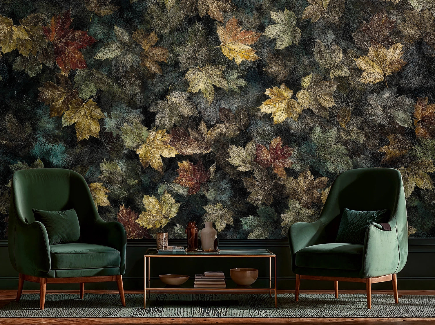 Step into the quiet reverence of an autumn forest, where each leaf tells a story of transformation and timeless beauty. This Wall Mural captures the ethereal dance of fallen foliage, scattered across a rich, textured canvas that evokes the forest floor. Inspired by nature's own artistry, the design celebrates the golden hour of the seasons with intricate maple and oak leaves in weathered golds, burnished coppers, and deep emerald shadows. Each element is rendered with painterly precision, creating a sophisticated botanical tapestry that transforms your space into a sanctuary of natural elegance. Atelier Merien presents this masterpiece as an invitation to embrace the serene beauty of nature's cycles.