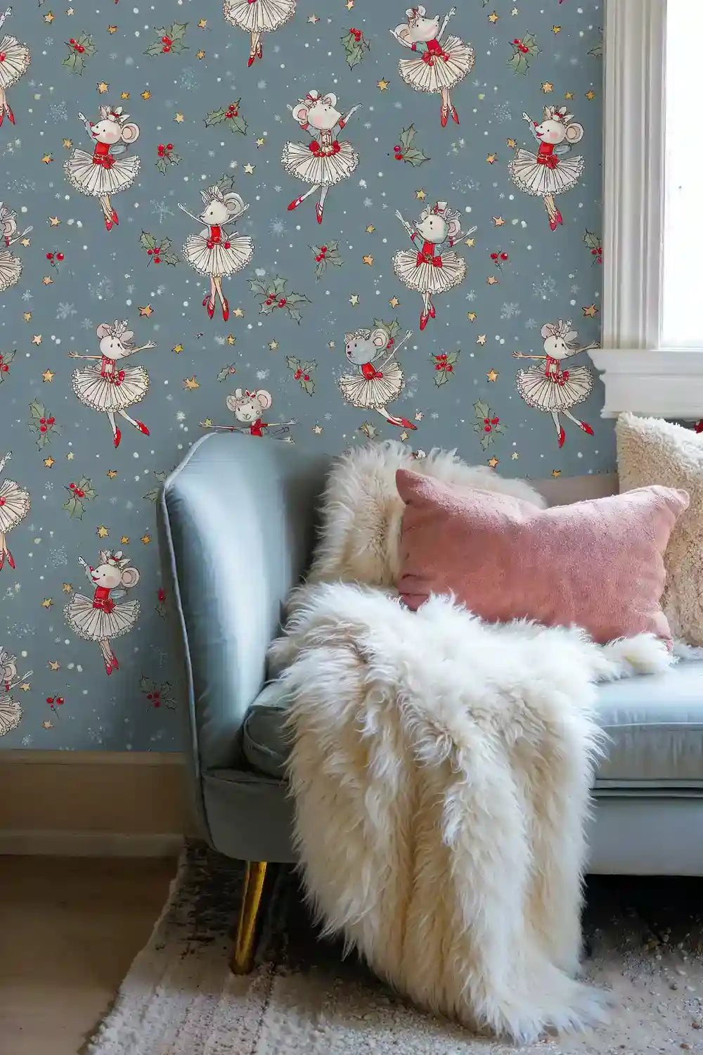 - The wallpaper features a soft dusty blue background with charming mice dressed in white tutus accented with bright red details, complemented by golden stars, white snowflakes, and green holly with red berries throughout the pattern.