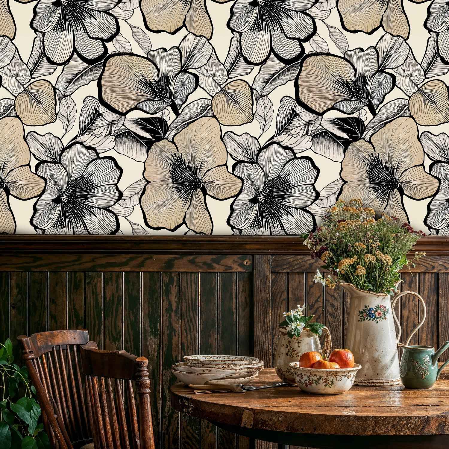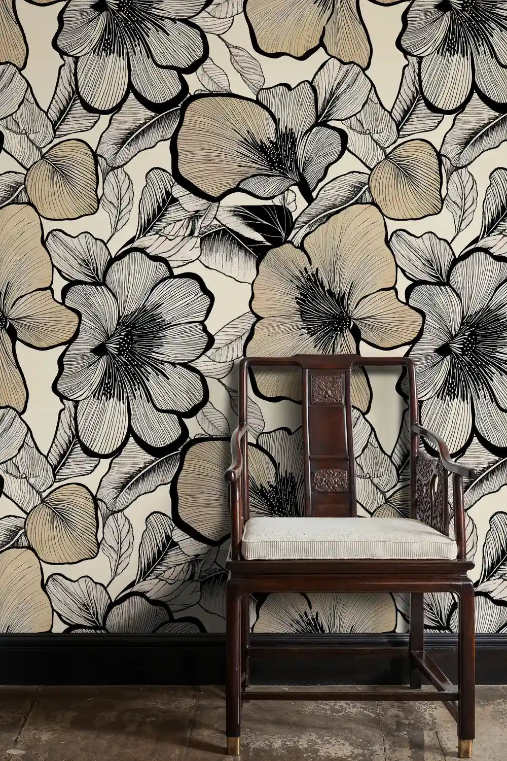 - A warm beige/ivory background anchors inky black floral outlines with soft grey leaf shading, creating a sophisticated, neutral look.