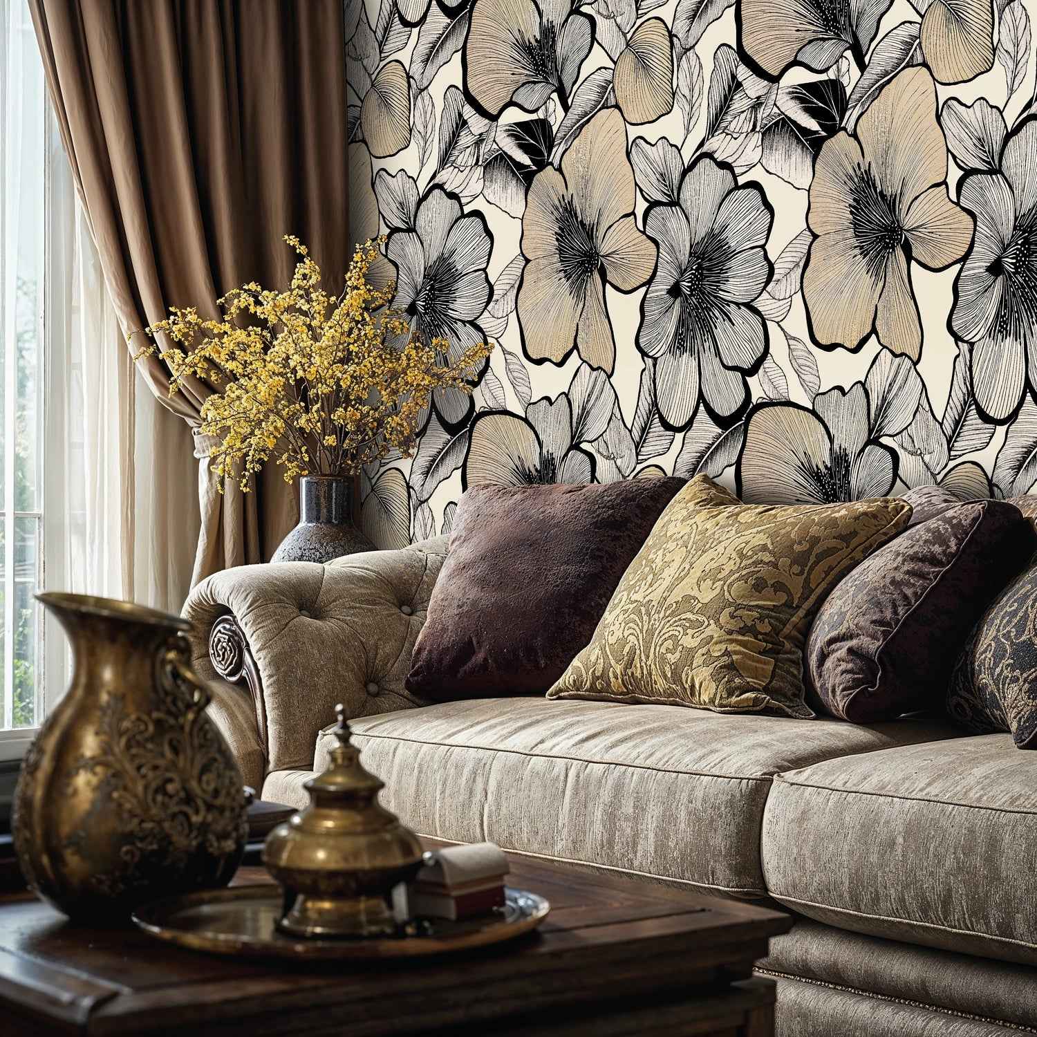 - Its bold line art and neutral palette suit Modern Classic, Japandi, and Eclectic spaces. The large blooms become a refined focal point alongside warm woods, matte black accents, linen textures, and touches of brass.