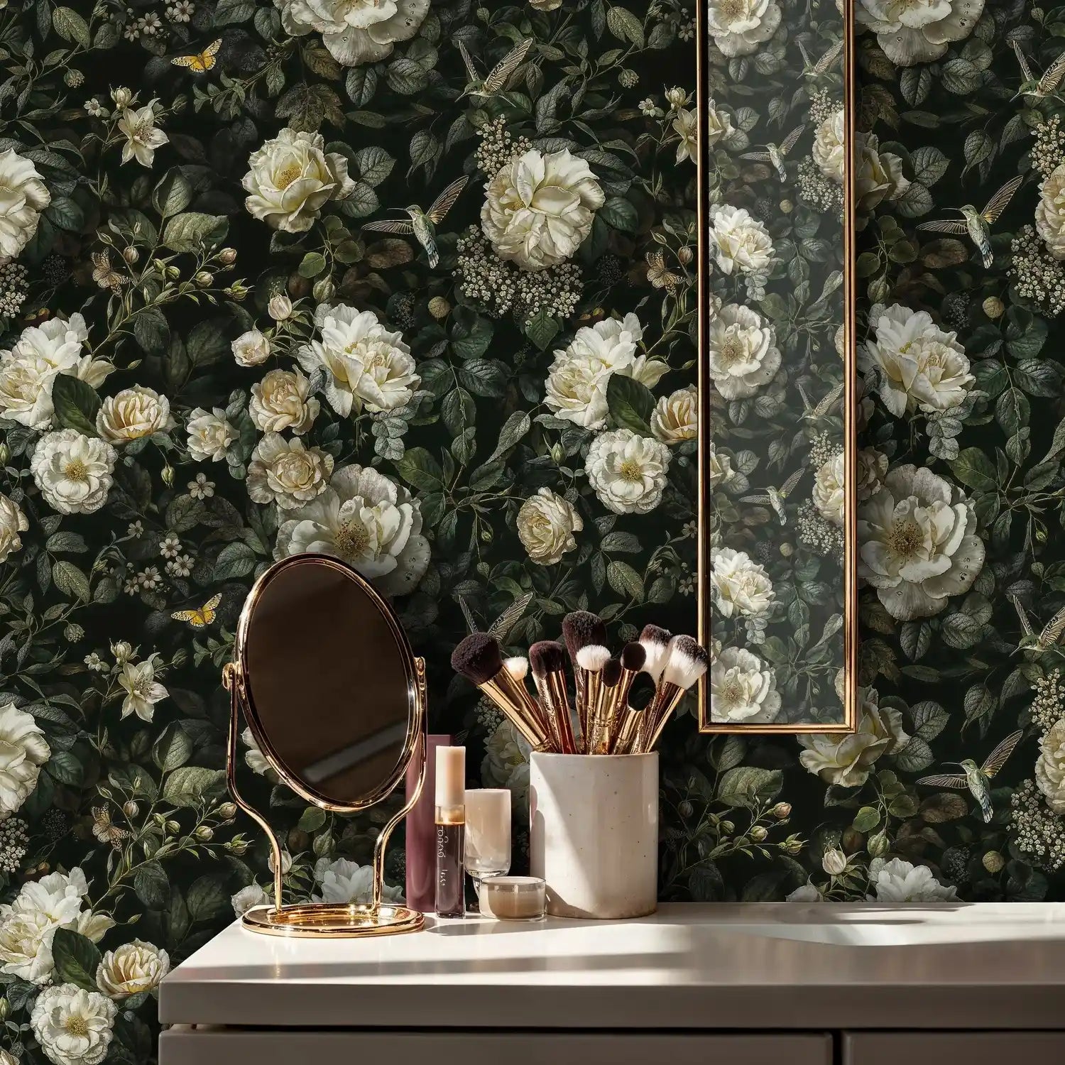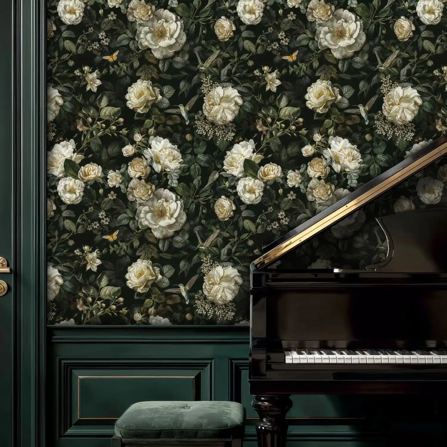 Step into a world where nature's most exquisite blooms come alive against a rich, dramatic backdrop. This stunning wallpaper captures the essence of a secret botanical garden, where cream-colored roses and delicate florals dance alongside graceful hummingbirds and golden butterflies. Inspired by classical botanical illustrations and romantic garden scenes, this design brings the timeless beauty of nature indoors with sophisticated elegance. Each element is meticulously detailed, creating a living tapestry that transforms any room into a sanctuary of natural wonder. Atelier Merien presents this masterpiece as more than wallpaper—it's an invitation to live within art itself.