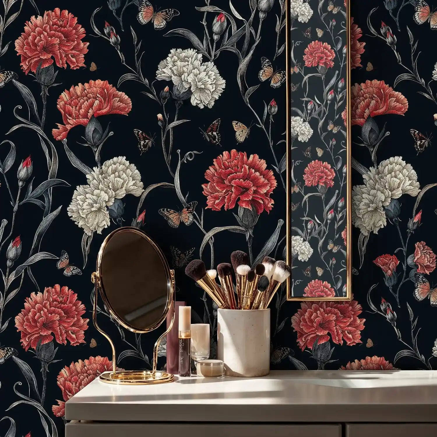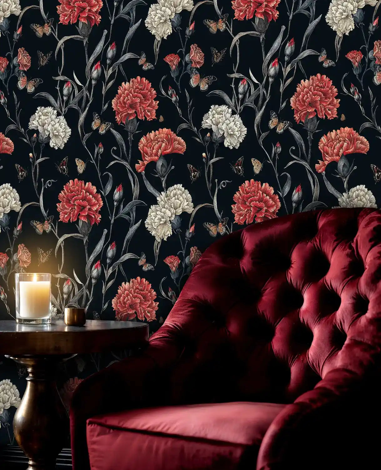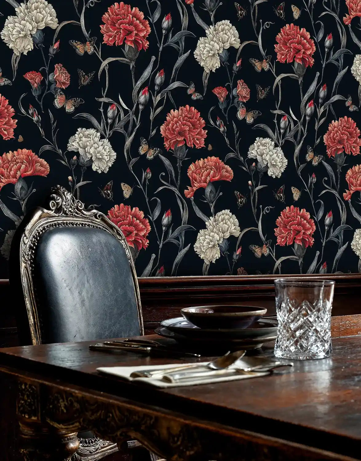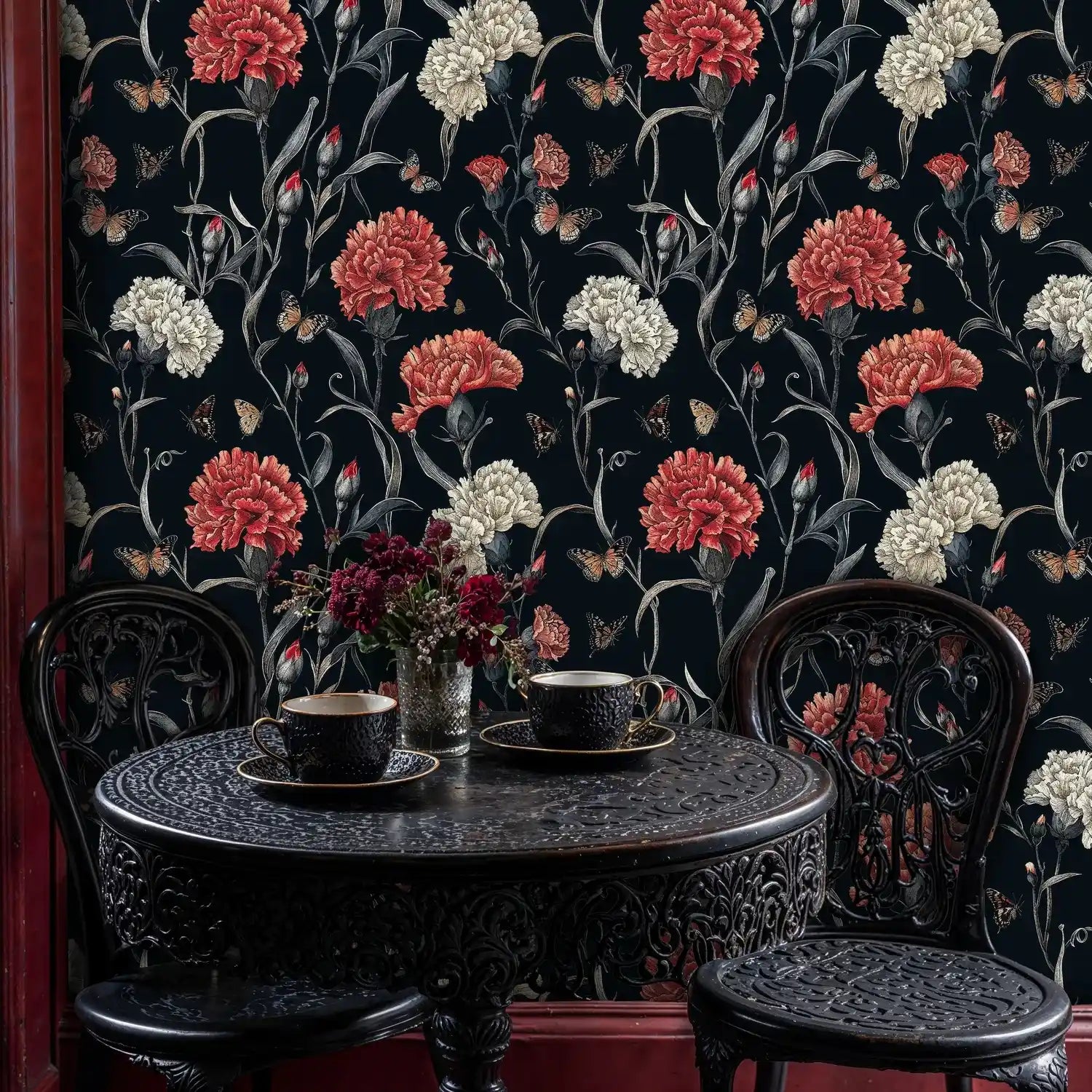 Step into a world where nature's drama unfolds in magnificent detail. This exquisite wallpaper captures the romantic essence of blooming carnations dancing with delicate butterflies against a rich, midnight backdrop. Inspired by classical botanical illustrations, each element tells a story of natural beauty and artistic refinement. Atelier Merien brings you a design that transforms any room into an intimate sanctuary where elegance meets the untamed beauty of nature's finest moments.