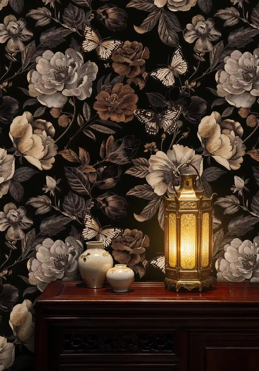 - This wallpaper embodies a sophisticated dark botanical style that blends vintage charm with contemporary elegance. The sepia-toned floral and butterfly motifs create a romantic, moody aesthetic perfect for maximalist, eclectic, or classic traditional interiors.