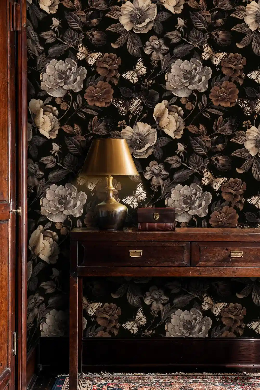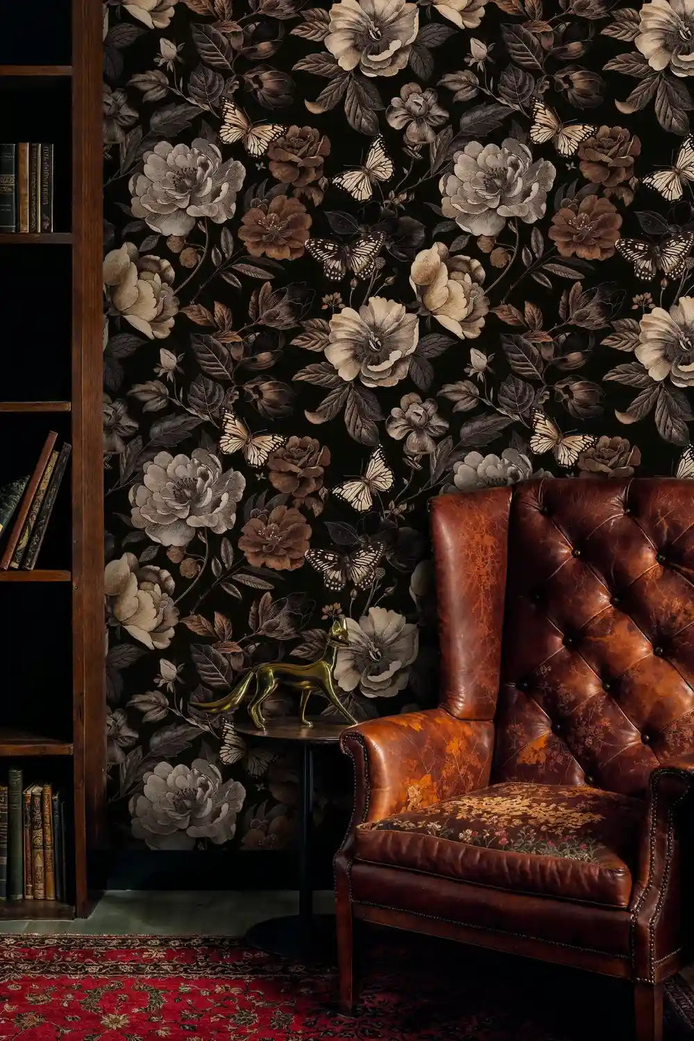- What design style does this dark floral butterfly wallpaper represent?