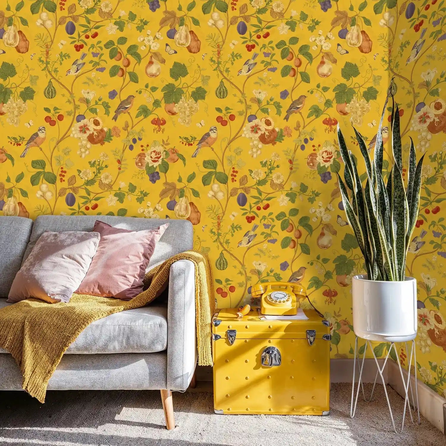 Step into a world where nature's bounty comes alive in stunning detail. This enchanting wallpaper design captures the essence of a flourishing garden where songbirds rest among vine-ripened fruits, delicate flowers, and verdant foliage. Inspired by classical botanical illustrations and the timeless beauty of nature's abundance, this golden-hued masterpiece brings warmth and sophistication to any space. From Atelier Merien comes this exquisite wallpaper that transforms ordinary walls into a celebration of natural artistry.