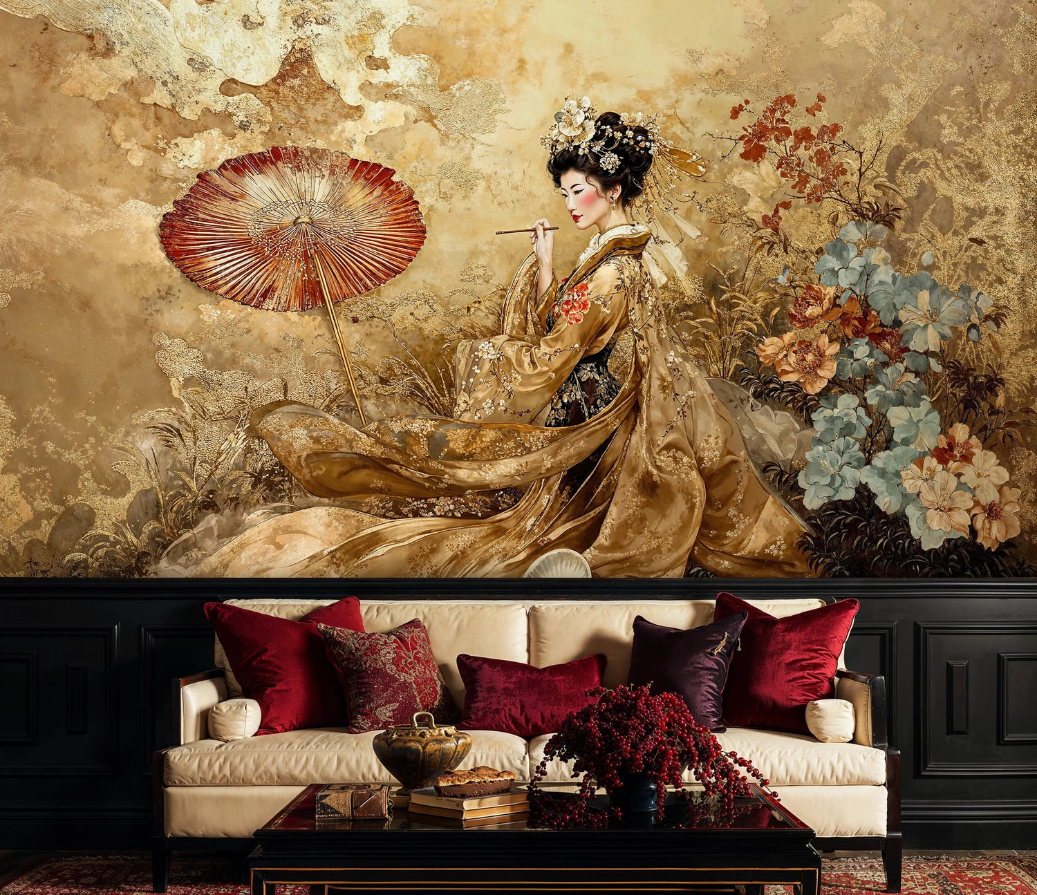 This stunning mural showcases meticulous attention to detail, from the delicate cherry blossoms and flowing fabric textures to the aged golden background that evokes ancient scrolls. The composition balances dramatic focal elements with subtle botanical accents, creating a harmonious design that serves as both statement art and sophisticated decor.
