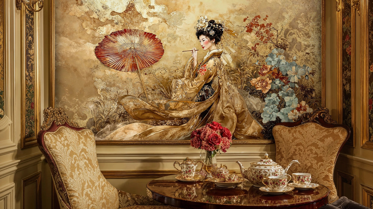 Step into a world where timeless beauty meets artistic mastery with this exquisite Japanese Geisha Garden Wall Mural. Inspired by traditional Eastern artistry, this captivating design features an elegant geisha adorned in flowing golden silk kimono, gracefully positioned amid a lush botanical paradise. The rich textures and warm golden tones create an atmosphere of serene luxury, while delicate floral motifs and a striking red parasol add layers of visual poetry to your walls. Crafted by Atelier Merien, this Wall Mural brings the tranquil sophistication of an oriental garden directly into your living space.